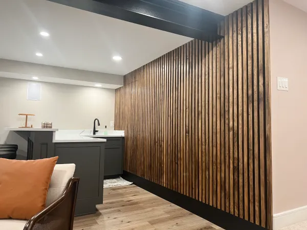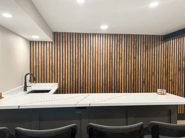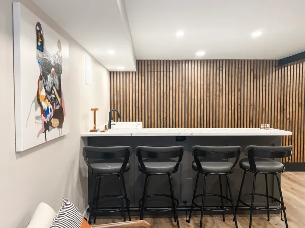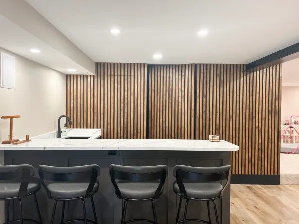 Mid Century Modern Basement Bar: This stunning bar is a focal point of this basement project featuring custom-built cabinets painted in Urbane Bronze, that exude sophistication and warmth. The Arezzo Quartz countertops provide a sleek, durable surface perfect for cocktail crafting and social gatherings. A custom slat wall with a cleverly hidden door adds an element of intrigue and seamless functionality. Matte black accessories and hardware, including a stylish foot rail and a dual-zone beverage cooler, elevate the space with modern elegance. Complementing it all is the LVP flooring, which offers both beauty and practicality, making your home bar a true masterpiece for entertaining and relaxation.
