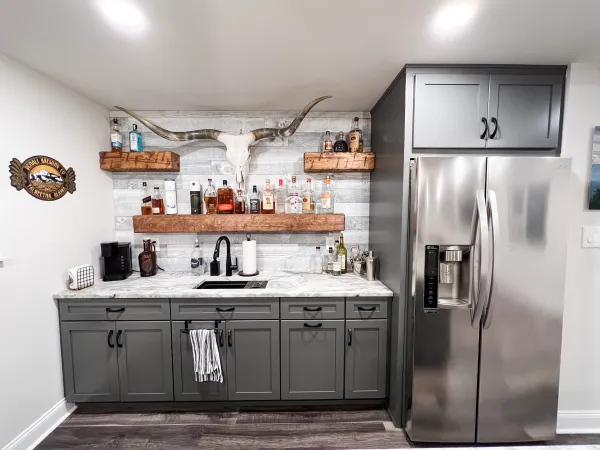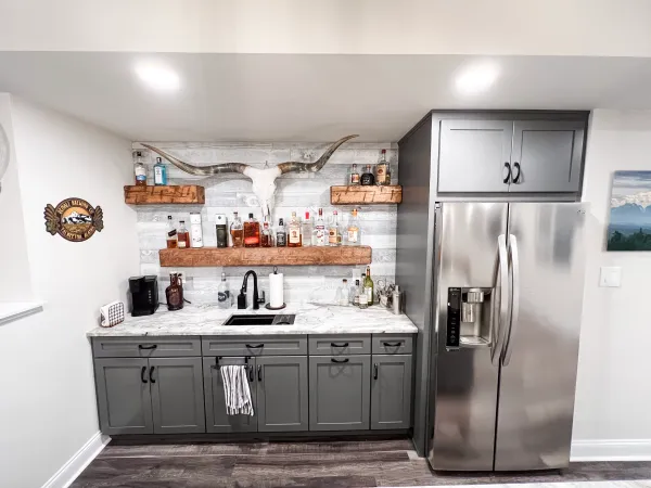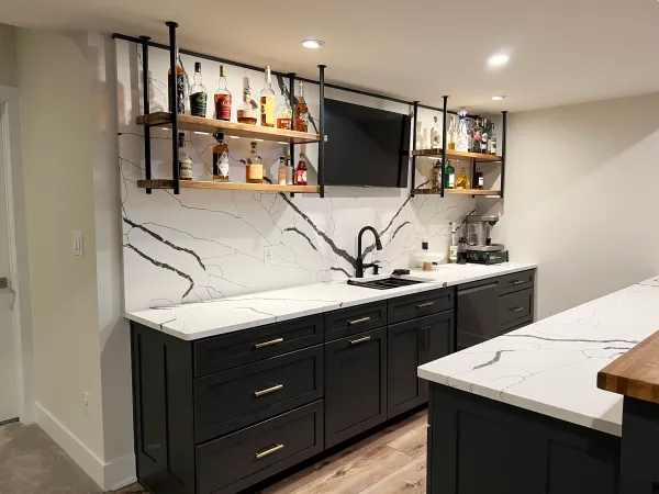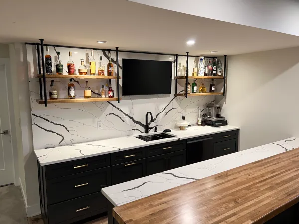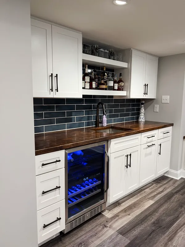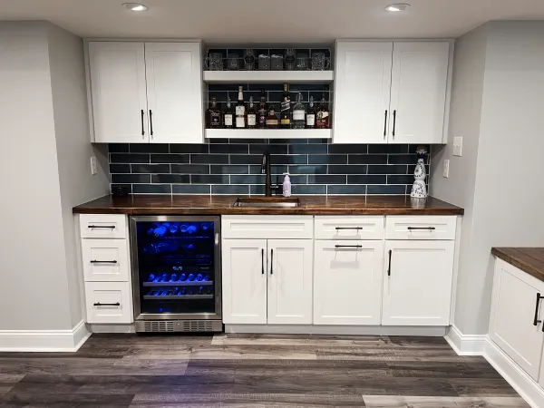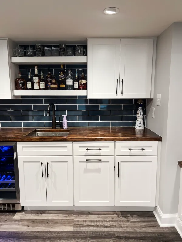 White Shaker with Blue Polished Tile Bar: This basement bar boasts elegant white shaker cabinets accented by sleek black hardware. The open shelving provides ample space to display your favorite spirits and glassware, while the American maple butcher top, finished with a rich dark walnut stain, adds a touch of rustic warmth. Equipped with a beverage cooler to keep your drinks perfectly chilled, the bar is as functional as it is stylish. The luxurious LVP flooring and striking blue polished ceramic tile backsplash complete the look, making this basement bar a sophisticated yet inviting space for entertaining.