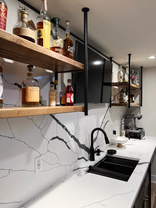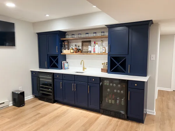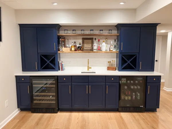 Admiral Blue Kitchenette: Our custom-built basement bar features stunning navy cabinets that add a touch of sophistication, complemented by open shelving made from rich pine wood for a rustic flair. The Pretoria Quartz countertop provides a durable and elegant surface, accentuated by a brushed brass bar faucet that exudes luxury. Our design includes two 24″ NewAir beverage and wine coolers, ensuring your favorite drinks are always at the perfect temperature. The artisan frost subway tile backsplash adds a modern touch, while the wine storage cube cabinets and kitchen cabinet towers offer ample space for all your bar essentials. Whether you’re a wine connoisseur or a cocktail enthusiast, our basement bar is designed to meet all your needs with style and functionality.