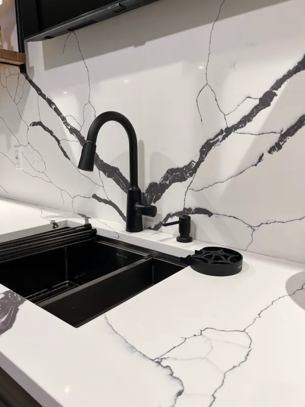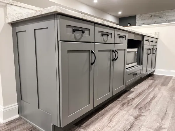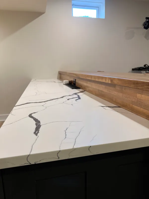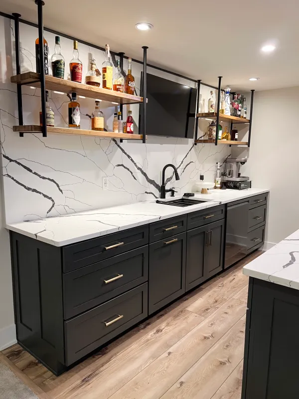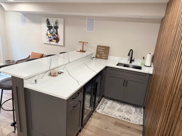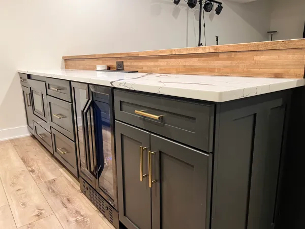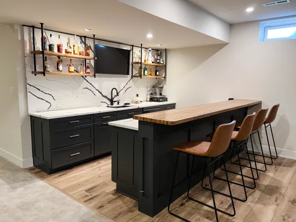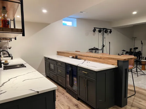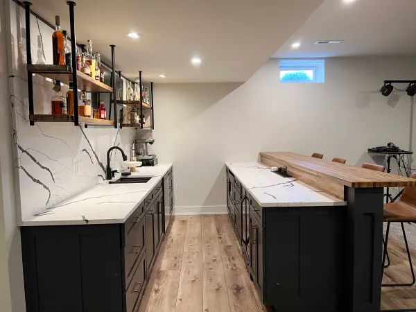 Iron Ore Basement Bar: Step down into the enticing ambience of our elegantly designed basement bar – a stylish escape from the everyday hustle. This bar is a masterpiece crafted within an already finished basement, an embodiment of robust functionality and chic aesthetics. The noteworthy iron ore cabinetry is immaculately counterpointed by the sophisticated Rafael Quartz Calacatta Black top and full splash, adding an opulent touch to the ambiance. Adding to the grace are the American maple open shelves and raised bar top, duly supported by irone abode shelf brackets. This bar isn’t just about looks; it’s about high functionality too. Integrated with a beverage cooler, dishwasher, microwave, and sink, it’s designed to meet all your entertainment needs. An innovative glass rinser adds an additional layer of convenience for the hosting duties. The bar is perfectly finished with LVP flooring, offering durability and a touch of warmth to the overall design. Experience the luxury of refined relaxation at this exquisite basement bar.
