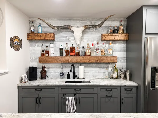 Reclaimed Wood Bar: Featuring a stunning wet bar adorned with a white reclaimed wood backsplash, it captures a rustic charm while maintaining modern elegance. The pewter cabinets, complemented by sleek black hardware, offer a sophisticated touch that pairs beautifully with the luxurious fantasy brown quartzite countertops. With a full-size fridge, you’ll have ample storage for all your beverages and ingredients. The dual-height counter is perfect for bar seating, ensuring comfort and versatility for any gathering. Additionally, barn beam open shelving not only provides practical storage solutions but also adds a unique, artisanal flair to the space. This basement bar is more than just a place for drinks; it’s a sanctuary of style and friendliness.