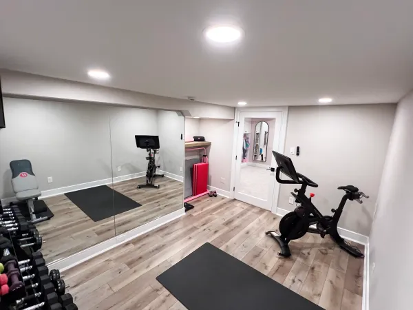 Health and wellness are a priority in this household, and the custom gym reflects that commitment. With floor-to-ceiling mirrors, LVP flooring, and ample space for both aerobic and weightlifting exercises, this gym is designed to meet all fitness needs.