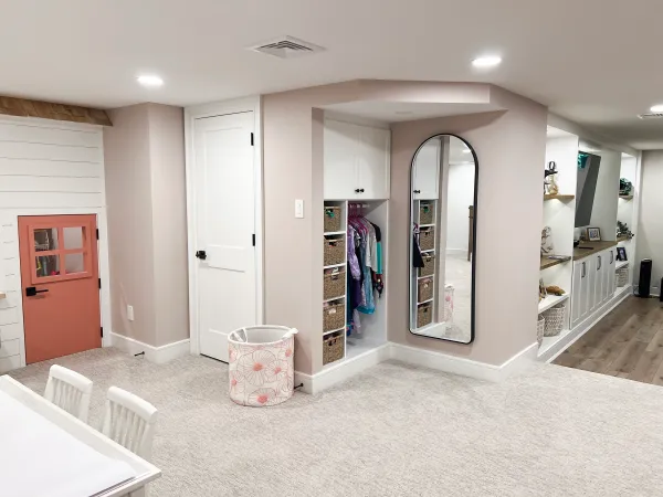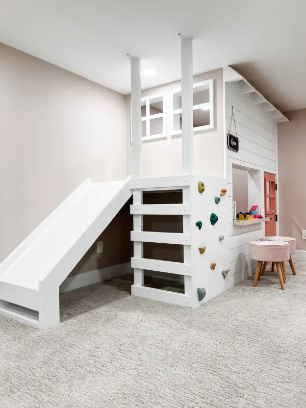 For the little ones, the custom playhouse, aptly named the “Kiddie Cafe,” is a dream come true. This whimsical space includes a ladder, slide, and hideout, providing endless hours of fun. The miniature door and butcher block counter are perfect for serving imaginary guests, while finished storage keeps toys and games organized. The dress-up area, complete with an illuminated mirror, accent lighting, custom shelving, and dedicated storage, adds a magical touch to this enchanting playroom.
