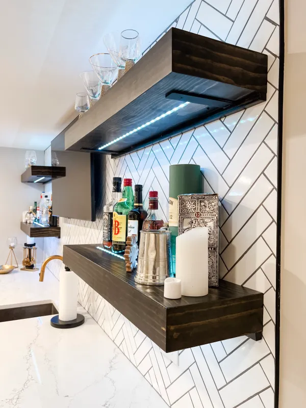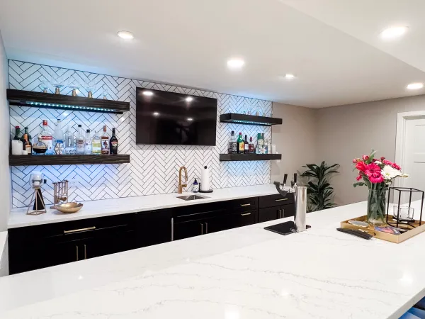 Right off the bat, the design themes scream modern sophistication: clean lines, minimalist color palettes, and a flourish of luxury materials. At the heart is a striking black bar – a statement piece that anchors the room. The bar is an entertainers dream, with a magnificent quartz countertop providing not only durability but also a touch of glam. It’s complemented by a subway tile chevron backsplash that adds depth and visual intrigue without overwhelming the space.