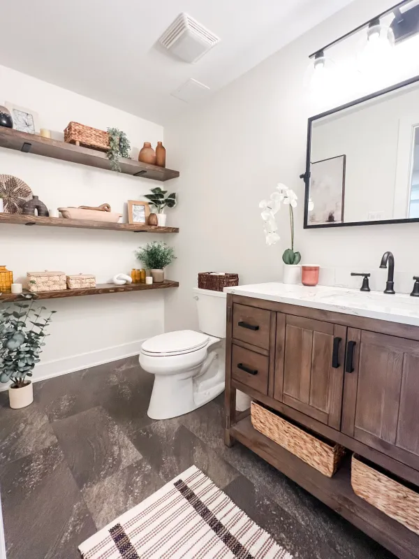 Step into the powder room and be greeted by warm custom open shelving that beautifully complements the vanity and flooring throughout the living space. And let’s not forget the captivating mural on the back wall that effortlessly grabs your attention.