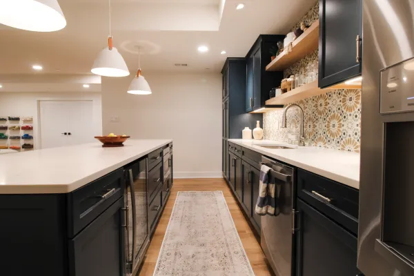 Introducing this stunning basement finish in Warrington, PA! Prepare to be wowed by the exquisite Maritime Blue kitchenette, complete with a spacious island. The kitchenette boasts Quartz countertops, a porcelain tile backsplash, and top-of-the-line appliances including a full-sized fridge, microwave, dishwasher, auxiliary beverage cooler, and open shelving.