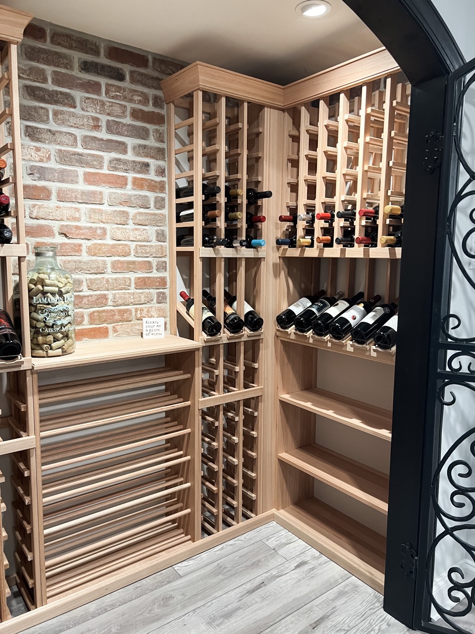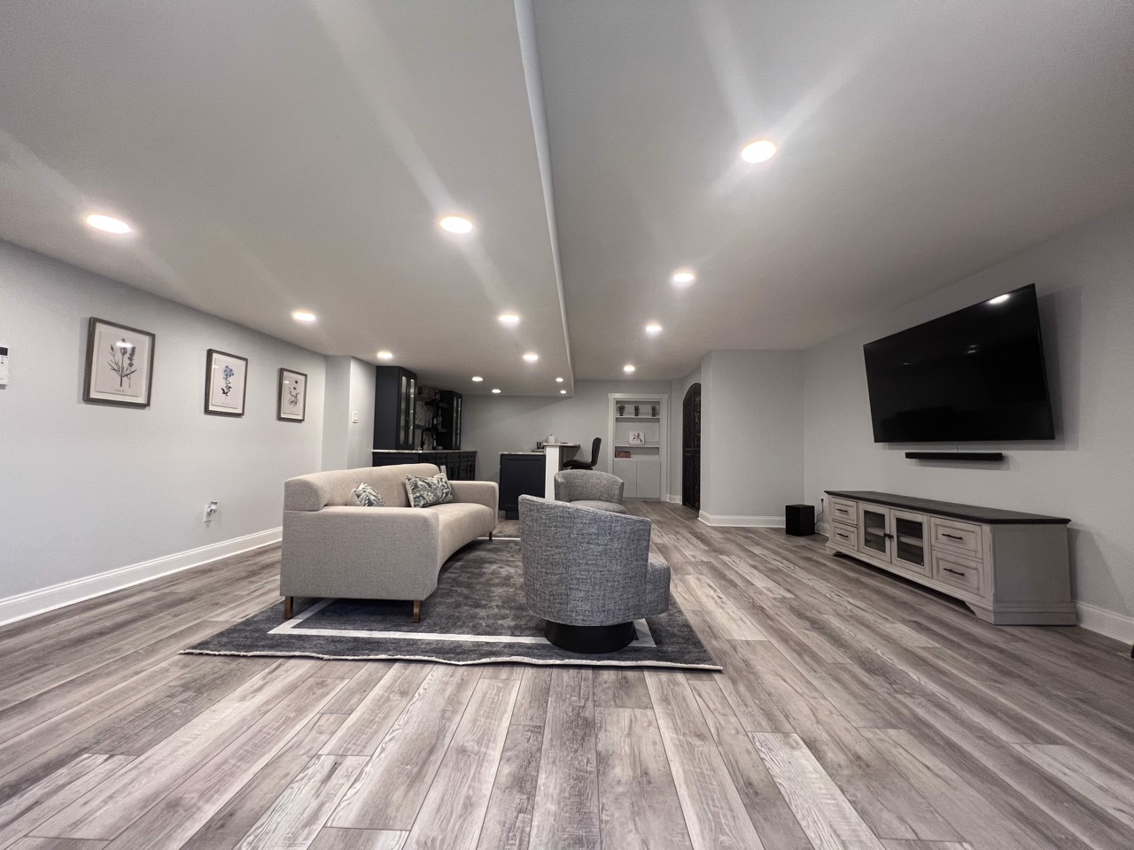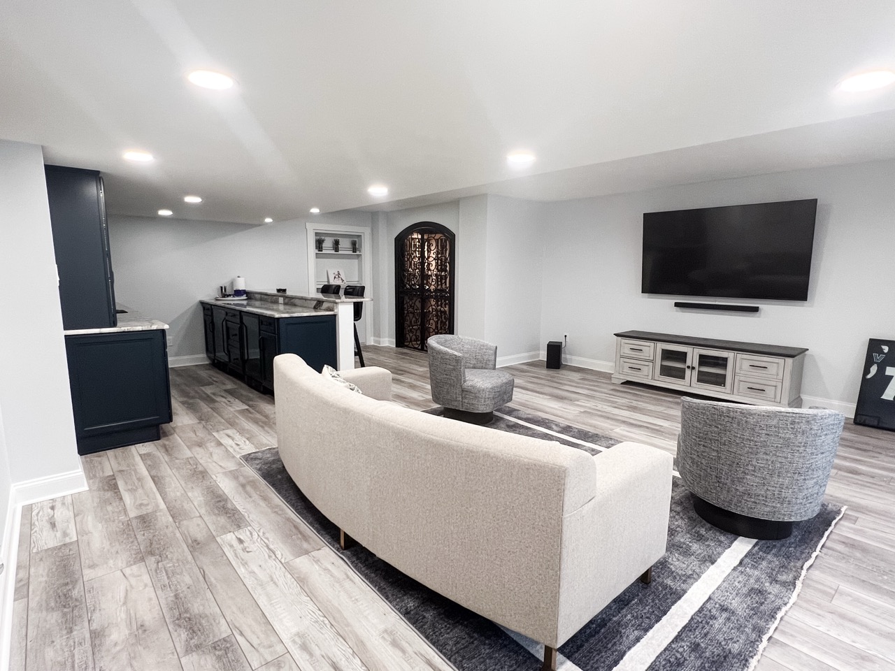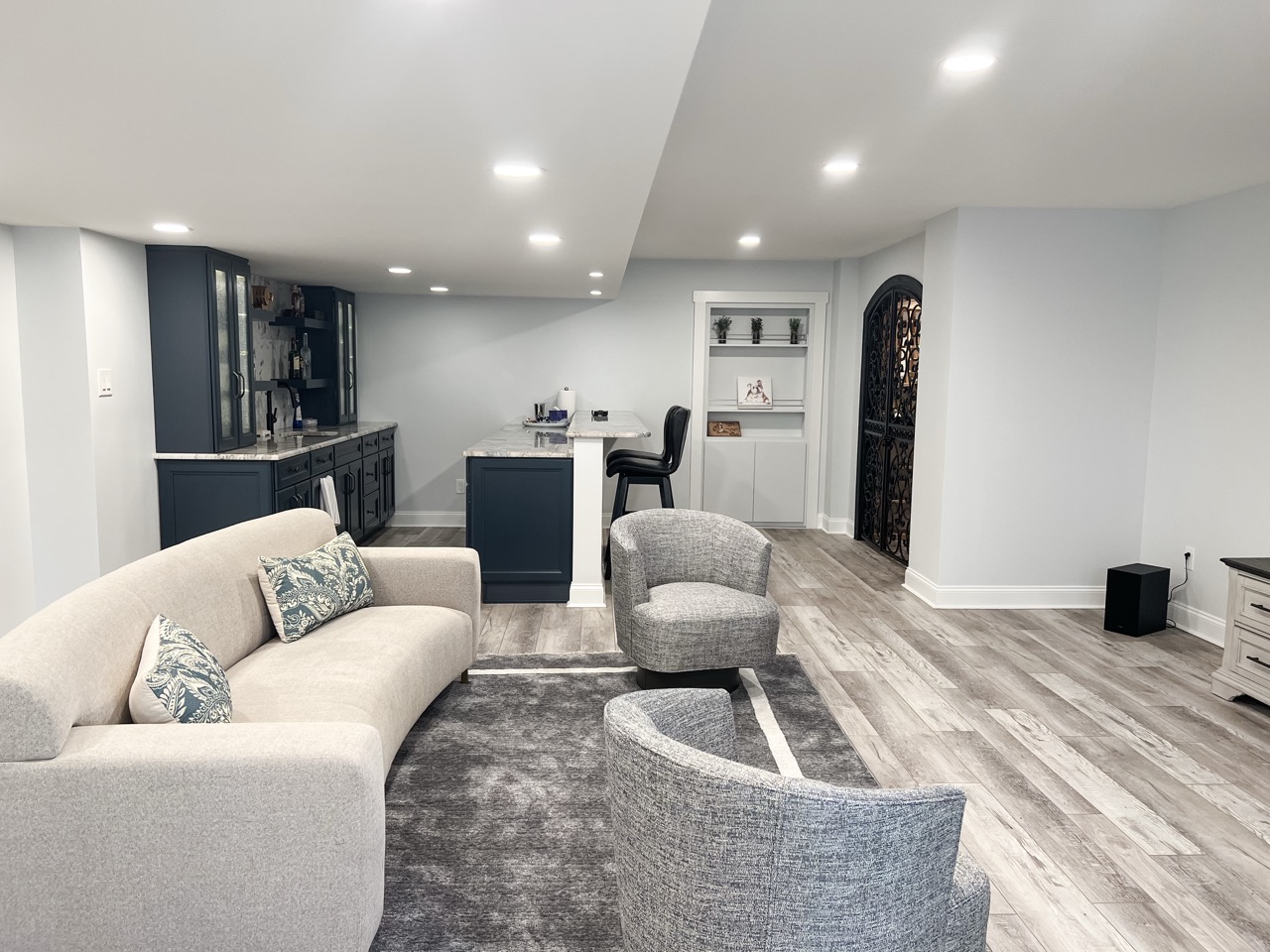 This basement finishing project includes a beautiful wet bar as the centerpiece, along with a walk-in wine cellar with a brick accent wall. We installed a murphy door to hide an unfinished area, expertly concealing storage without compromising on style. This basement incorporates high-end finishes, practical features, and luxe amenities that the homeowners can truly enjoy.
