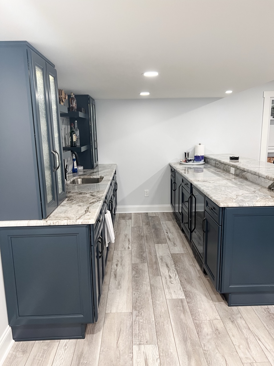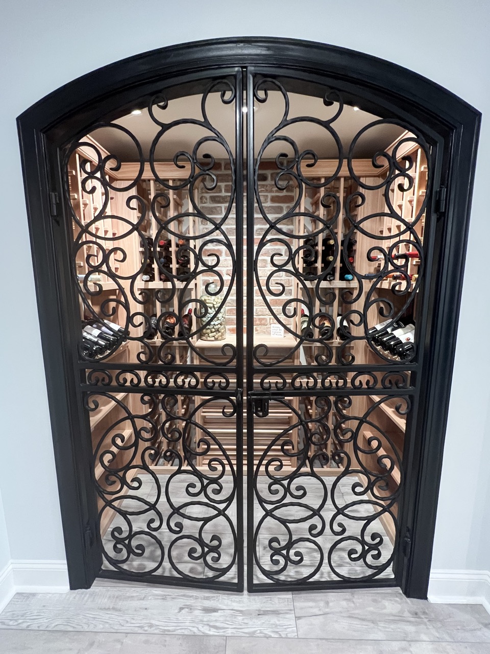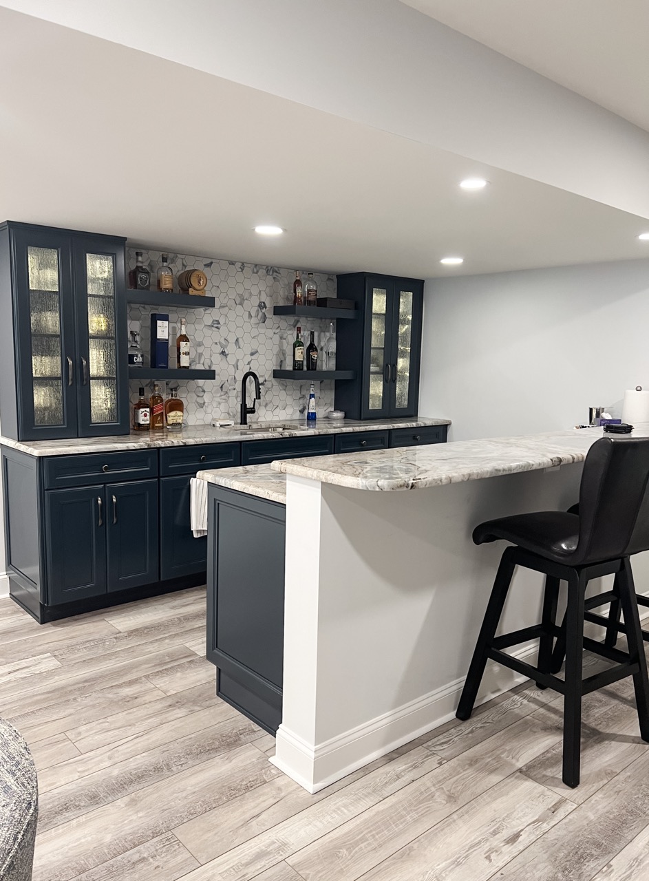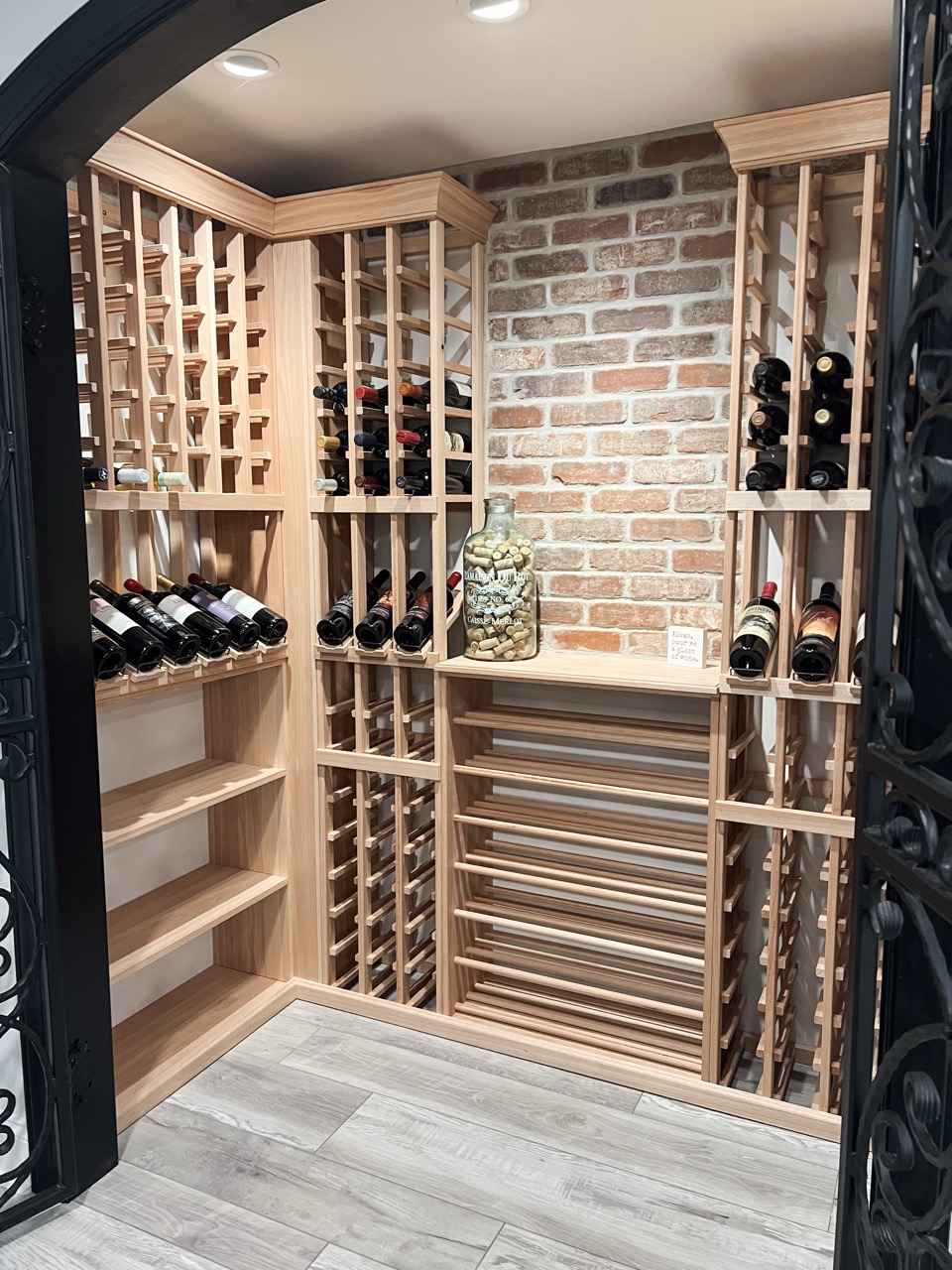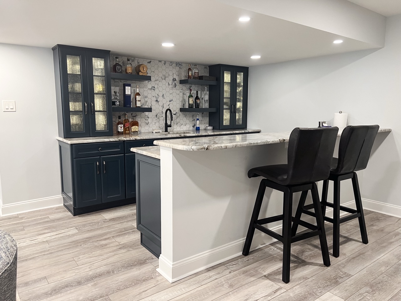 This basement finishing project includes a beautiful wet bar as the centerpiece, along with a walk-in wine cellar with a brick accent wall. We installed a murphy door to hide an unfinished area, expertly concealing storage without compromising on style. This basement incorporates high-end finishes, practical features, and luxe amenities that the homeowners can truly enjoy.