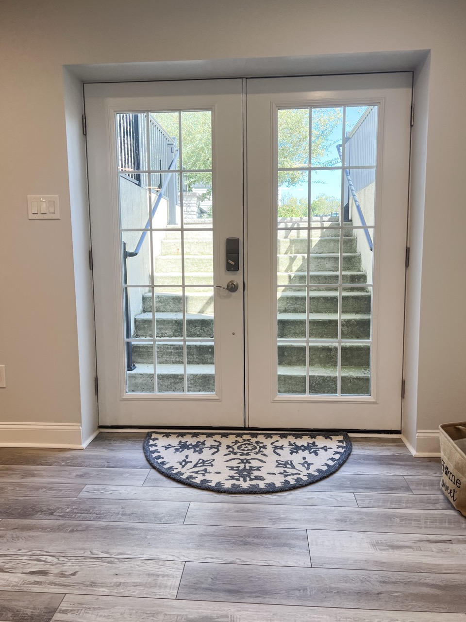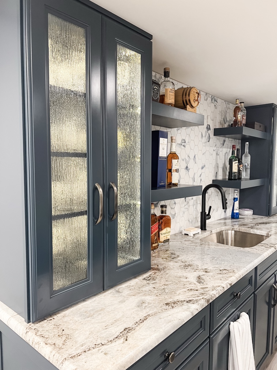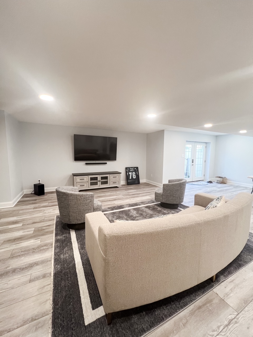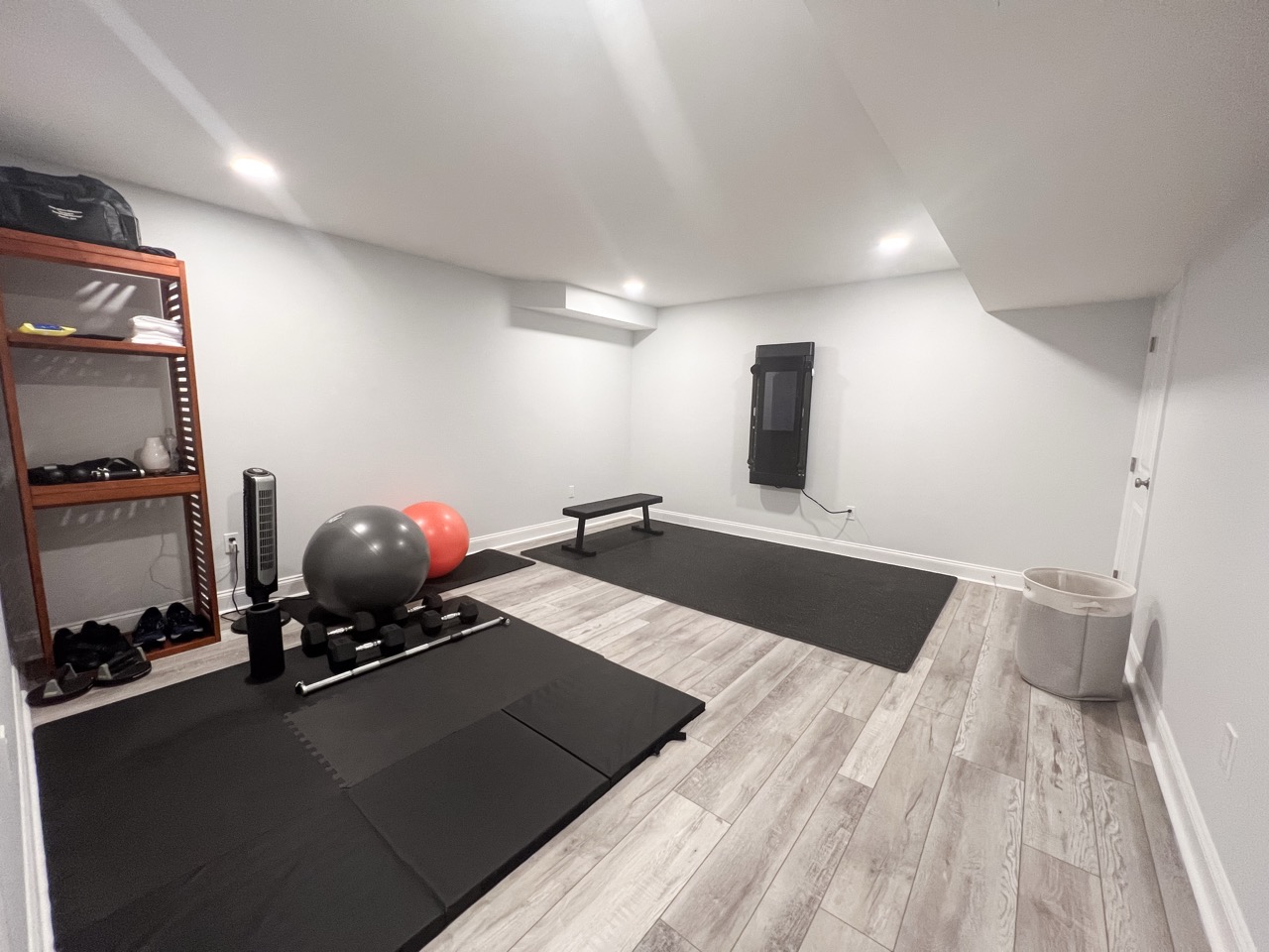 This basement finishing project includes a beautiful wet bar as the centerpiece, along with a walk-in wine cellar with a brick accent wall. We installed a murphy door to hide an unfinished area, expertly concealing storage without compromising on style. This basement incorporates high-end finishes, practical features, and luxe amenities that the homeowners can truly enjoy.