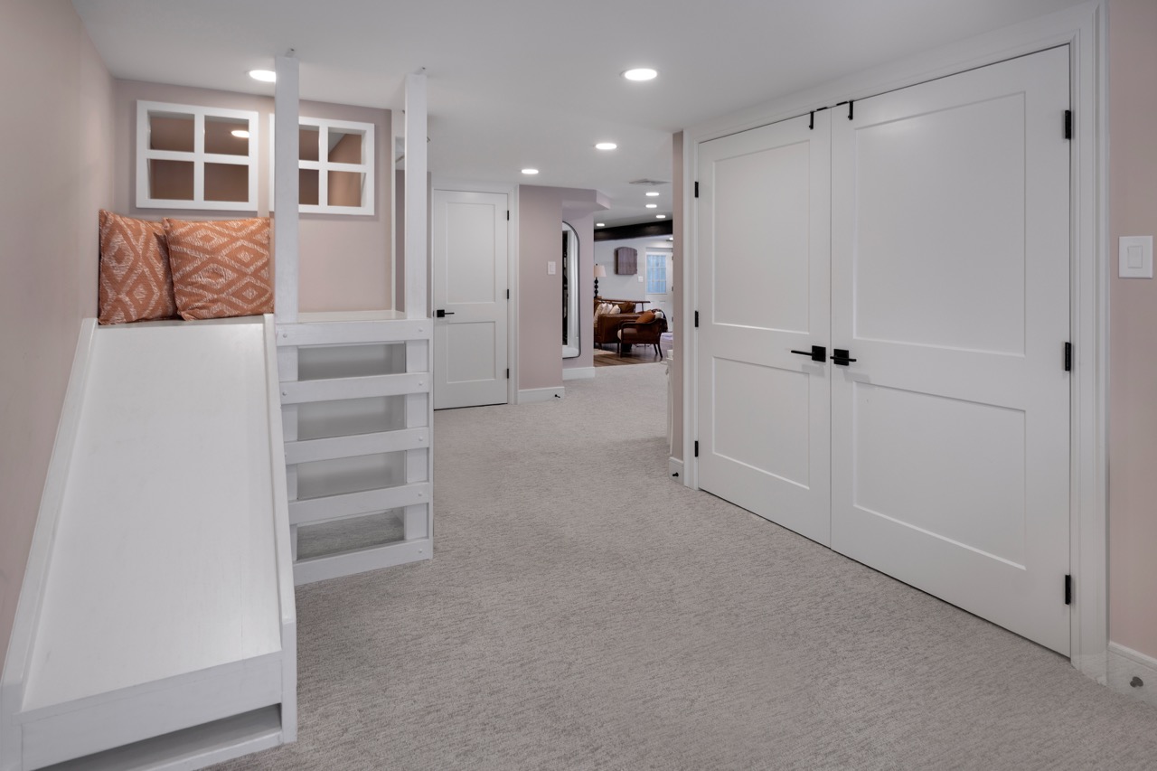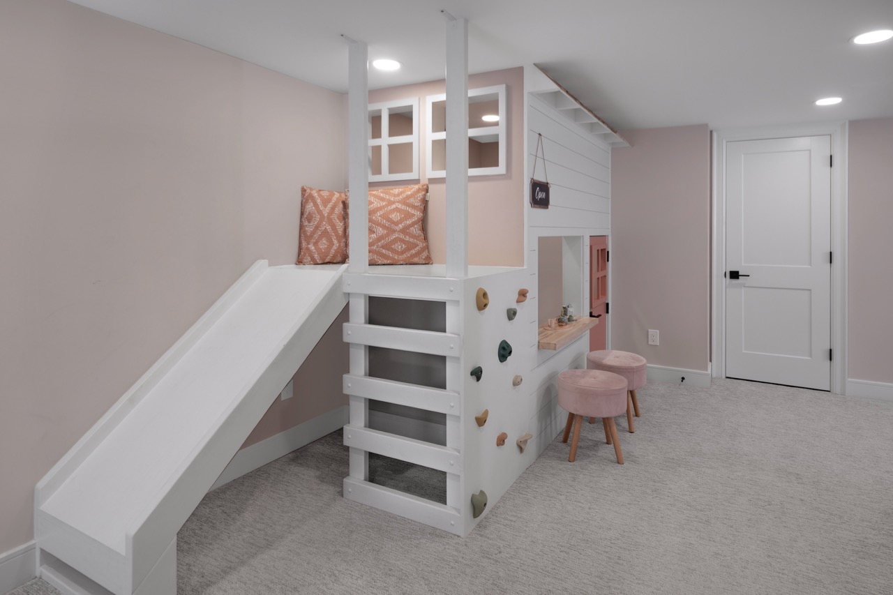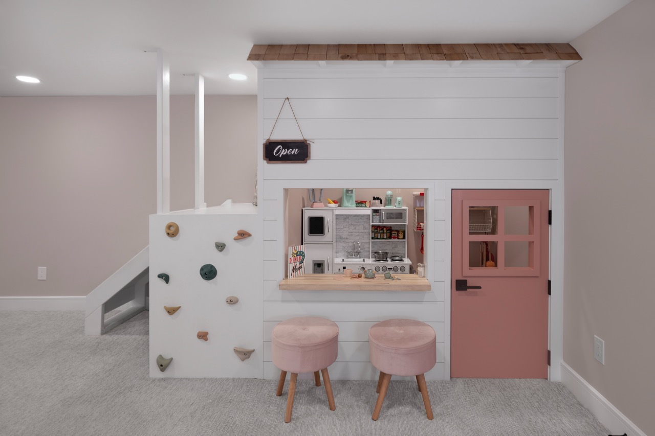 This midcentury-inspired basement renovation features an entertainment and bar space with a custom wet bar, dual-zone beverage cooler, and built-in entertainment center with plenty of storage. In addition, a custom playroom features a playhouse for kids with a ladder, slide, and hideaway — creating a magical space for children. Finally, the custom half bath and fitness area are functional and stylish, making this basement a true multi-functional space.