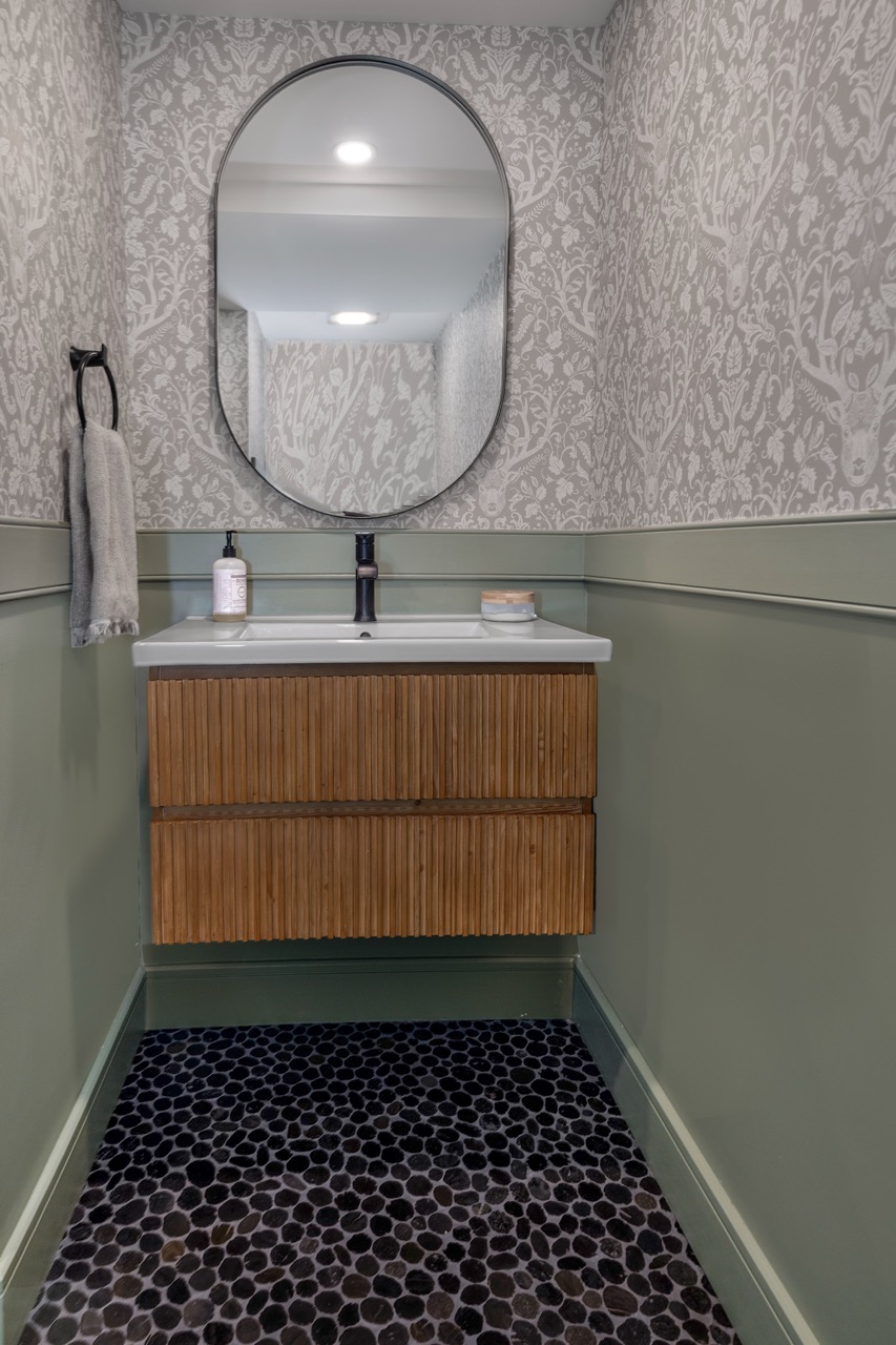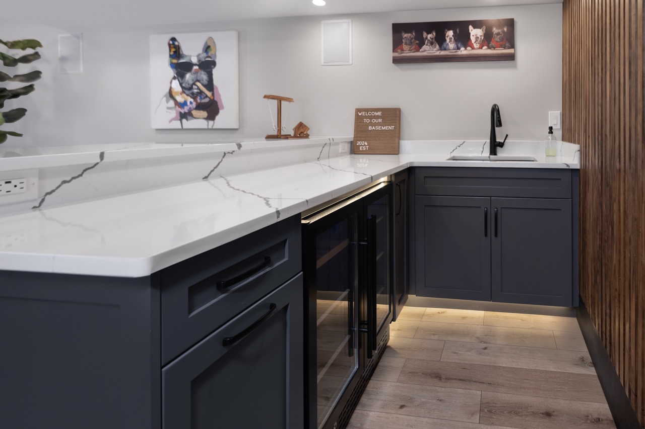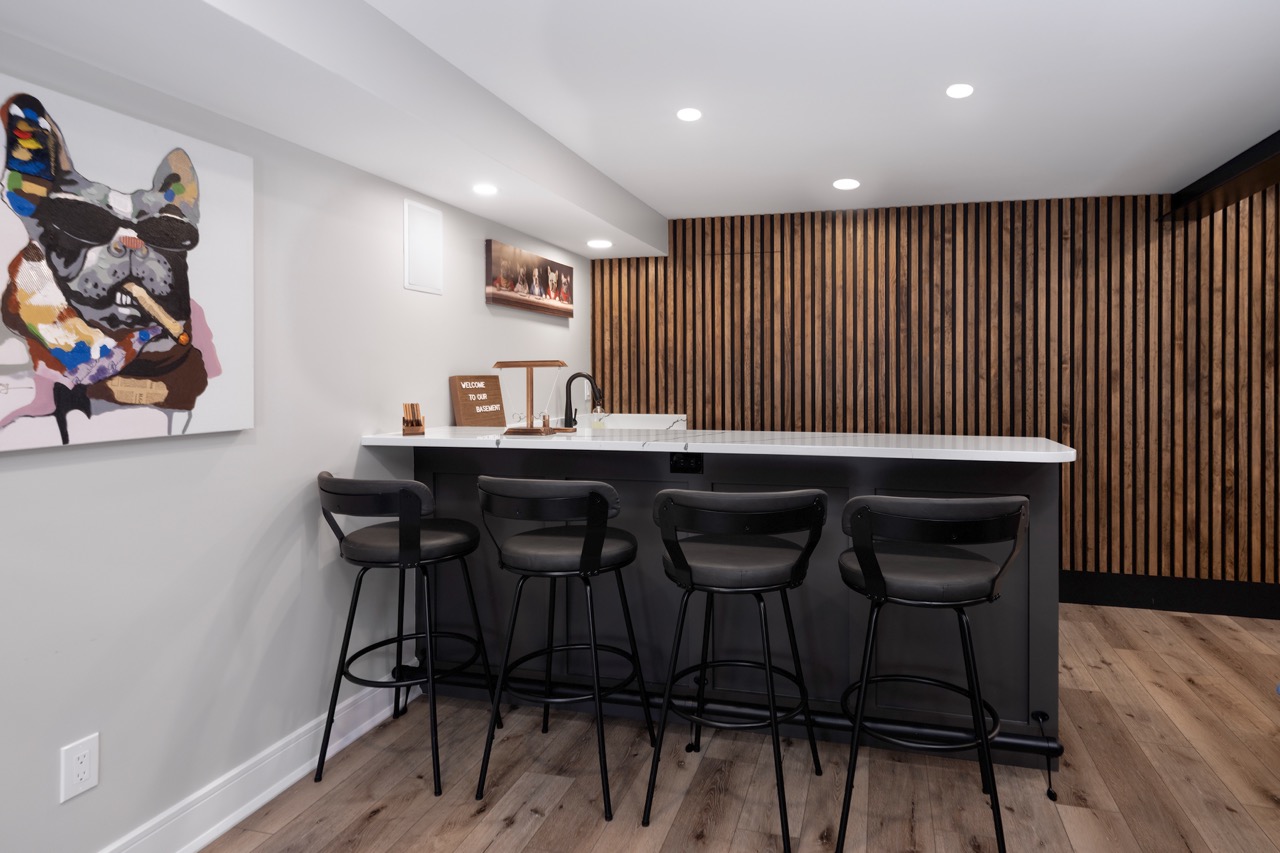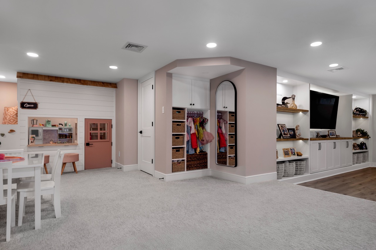 This midcentury-inspired basement renovation features an entertainment and bar space with a custom wet bar, dual-zone beverage cooler, and built-in entertainment center with plenty of storage. In addition, a custom playroom features a playhouse for kids with a ladder, slide, and hideaway — creating a magical space for children. Finally, the custom half bath and fitness area are functional and stylish, making this basement a true multi-functional space.