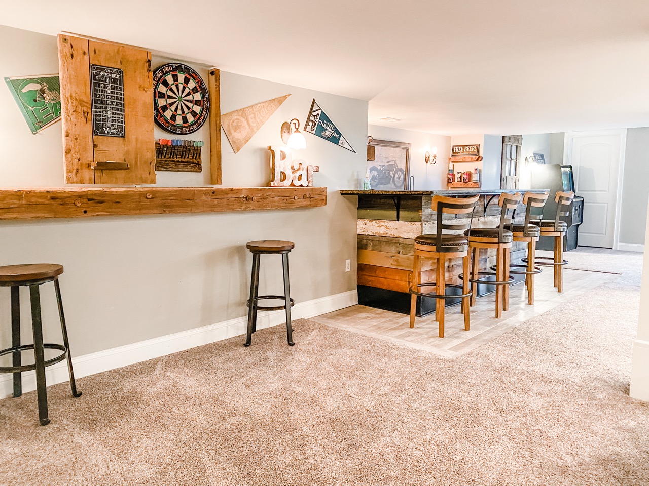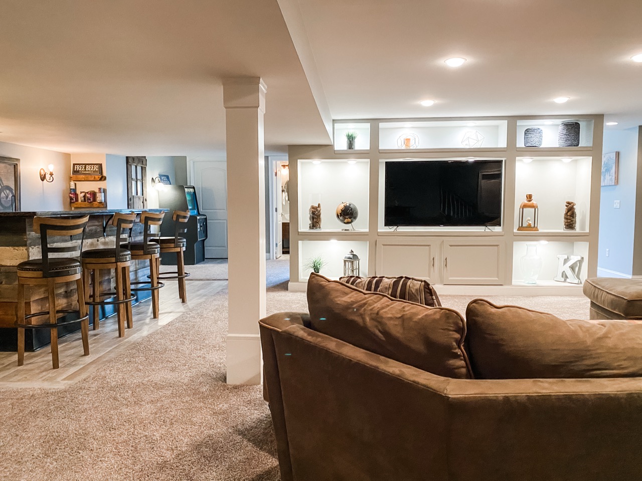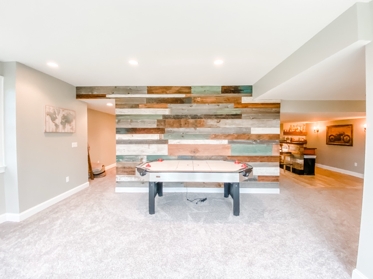 Real barn wood and a reclaimed beam were incorporated into this basement to add a modern farmhouse theme. With dimmable lighting, a custom entertainment center with accent lights, and a wet bar, this basement is perfect for entertaining.