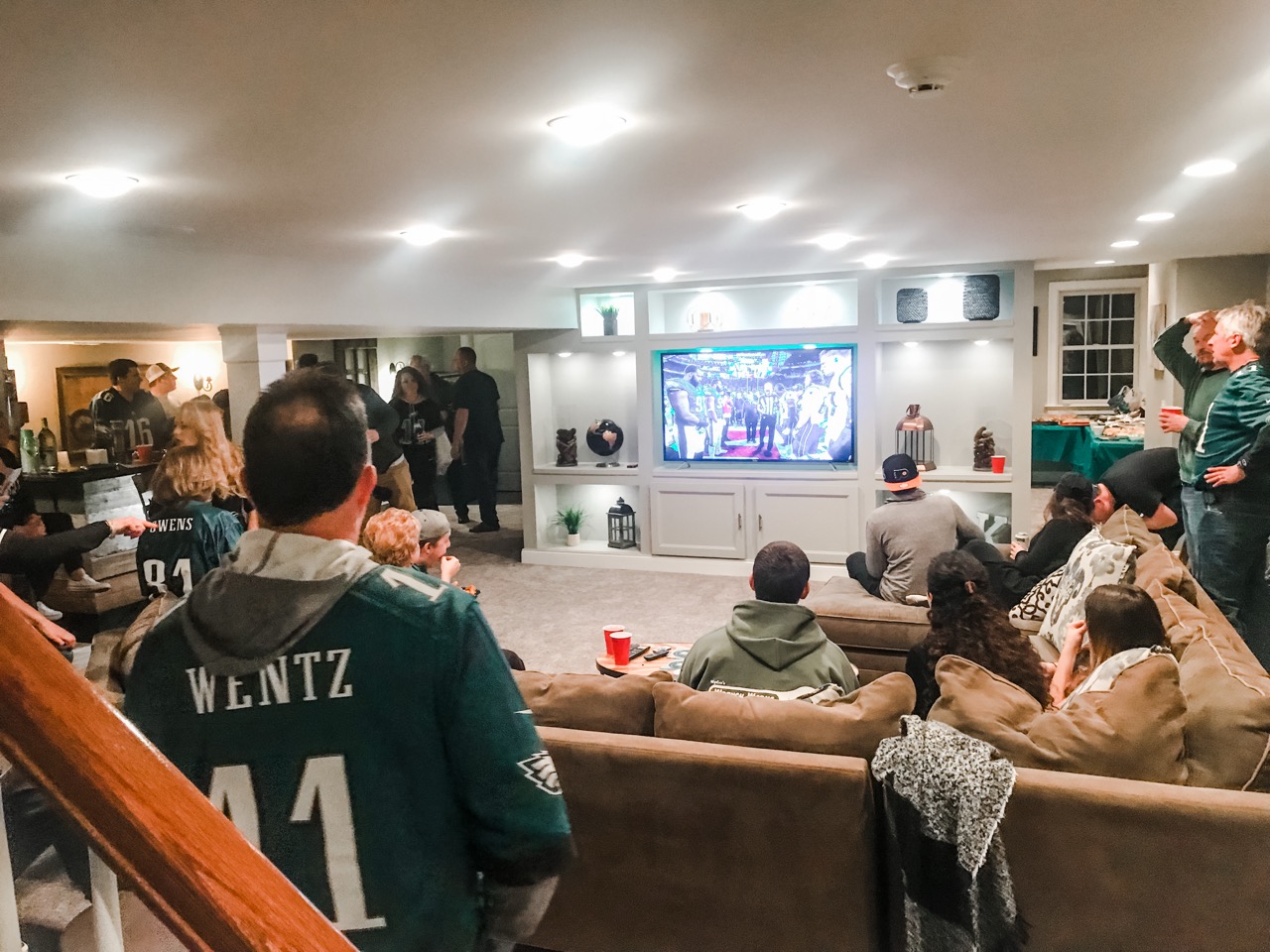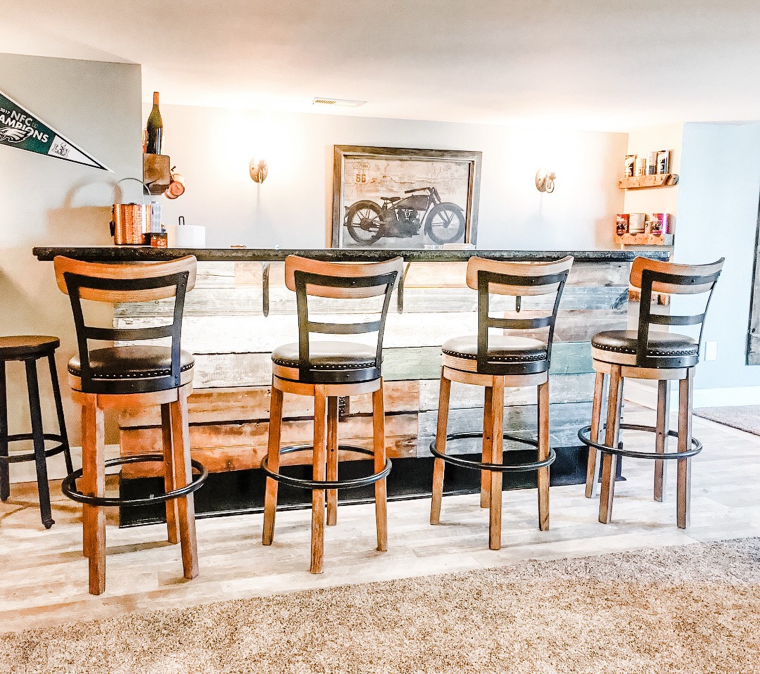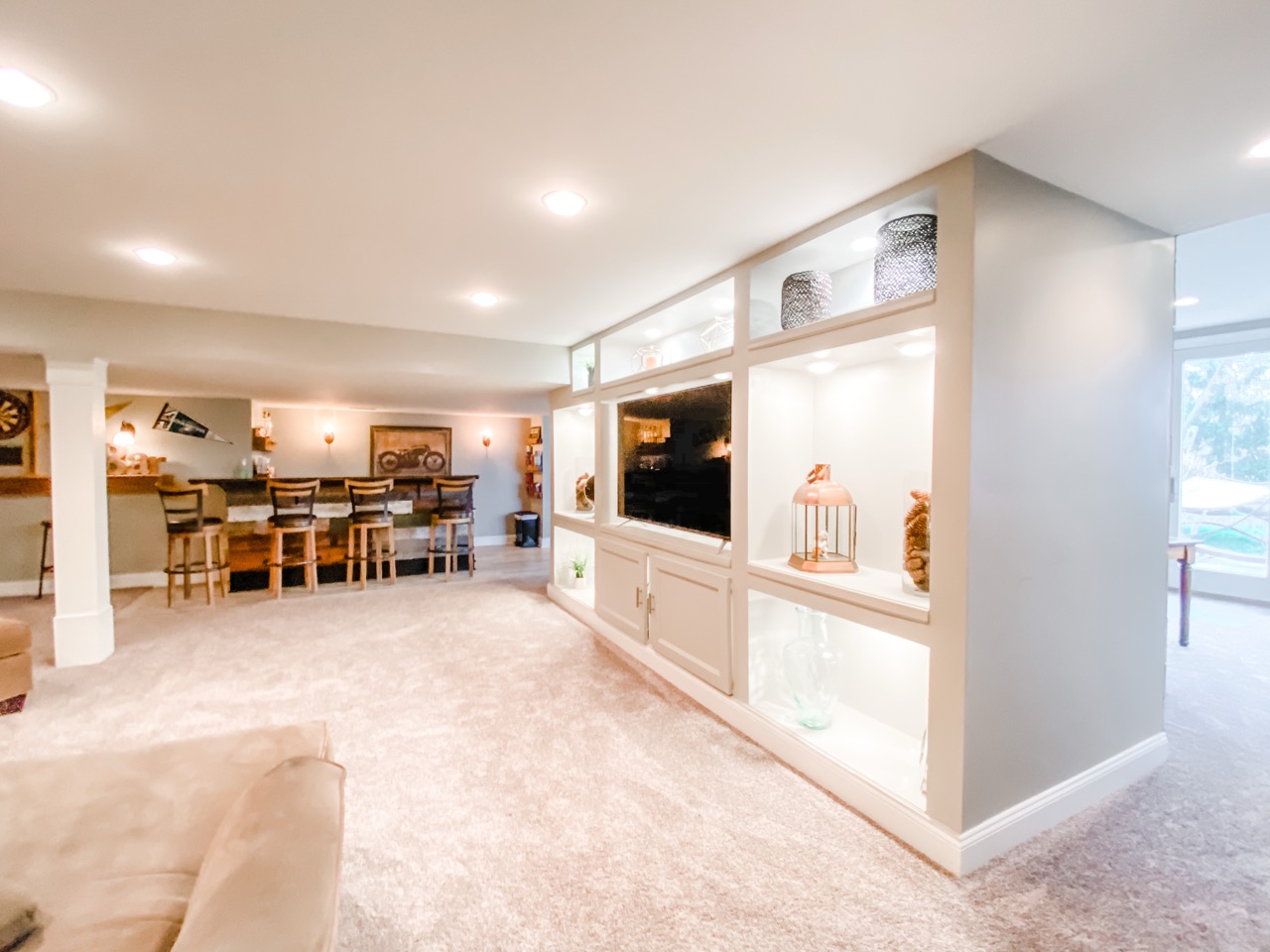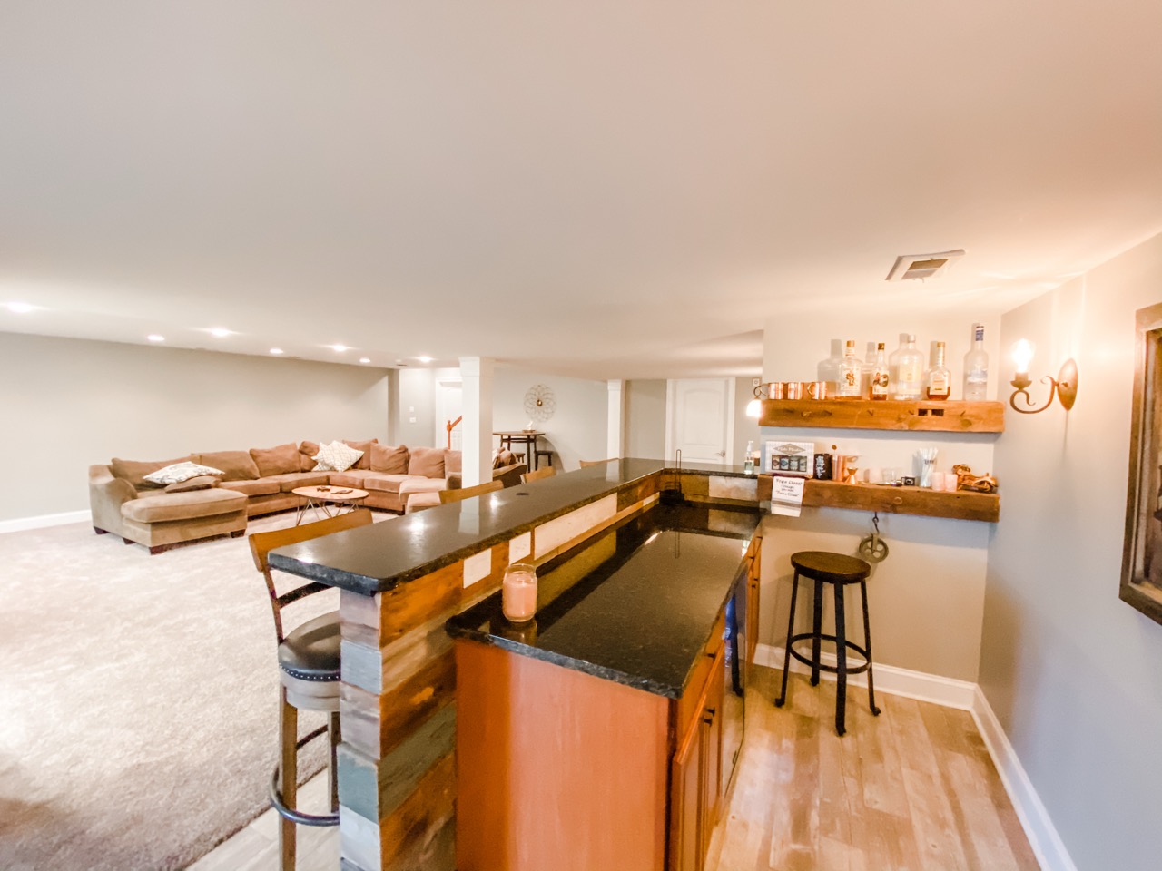 Real barn wood and a reclaimed beam were incorporated into this basement to add a modern farmhouse theme. With dimmable lighting, a custom entertainment center with accent lights, and a wet bar, this basement is perfect for entertaining.
