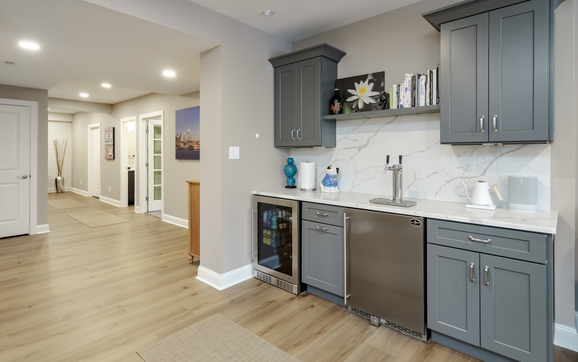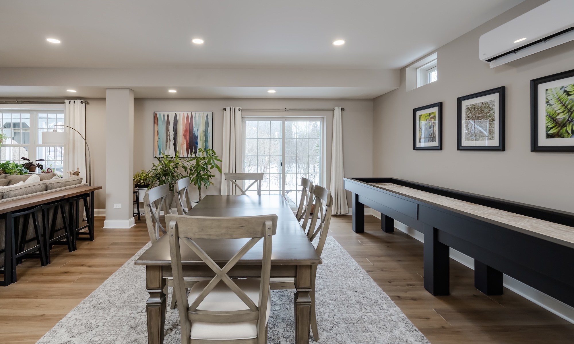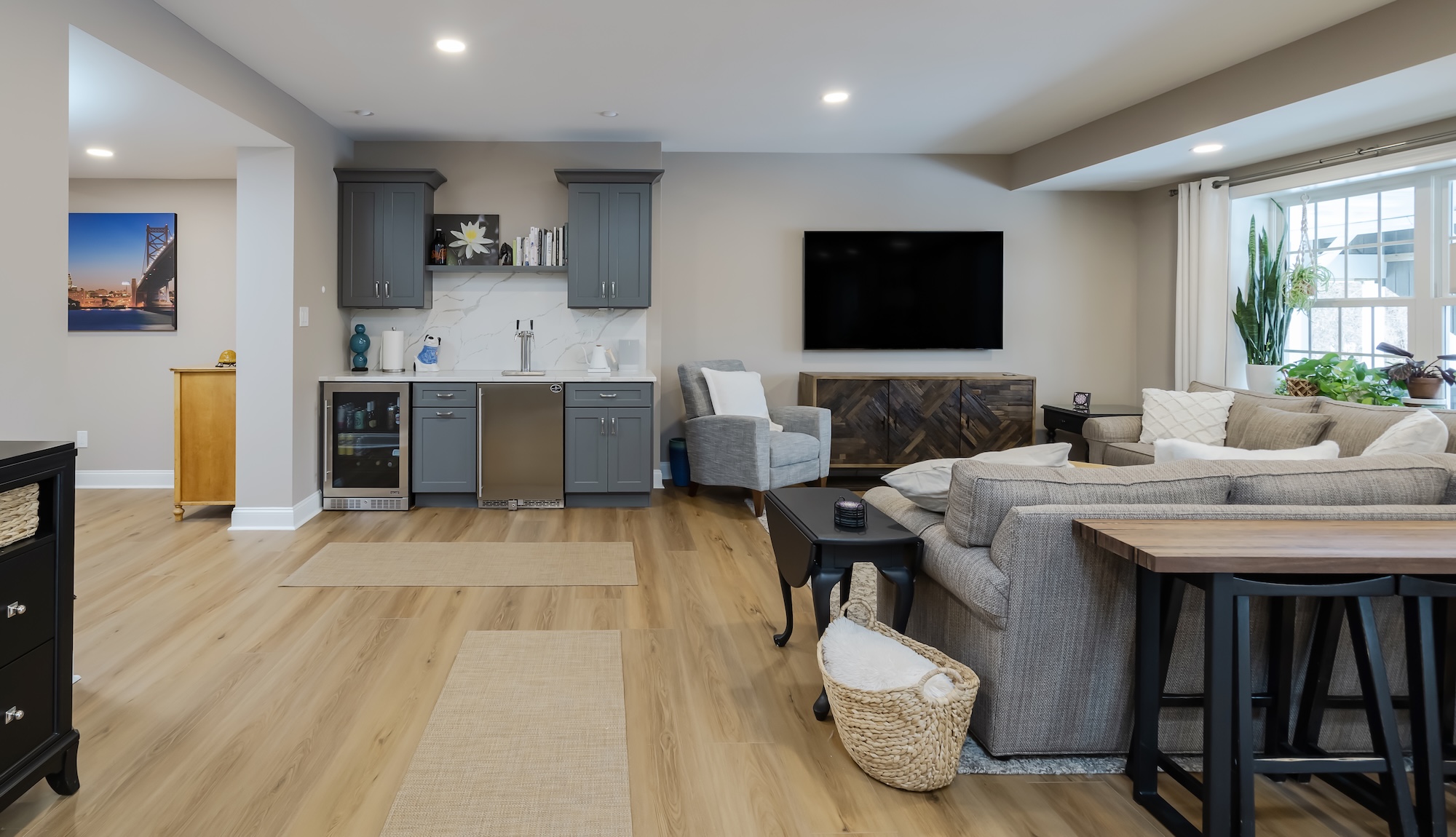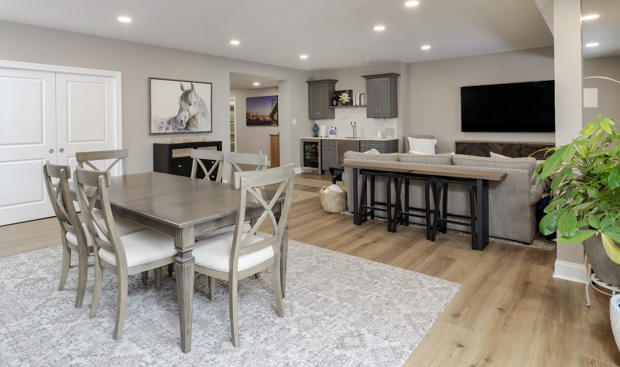 Beautifully finished basement in the Meadow Glen Community featuring a modern open-concept layout with luxury vinyl plank flooring, recessed lighting, and a bright, neutral design. The space includes a spacious living area, custom wet bar with gray cabinetry and beverage fridge, and a dedicated dining area with sliding glass doors for abundant natural light and walk-out access. Versatile and thoughtfully designed, it’s ideal for entertaining, relaxing, or a home office.