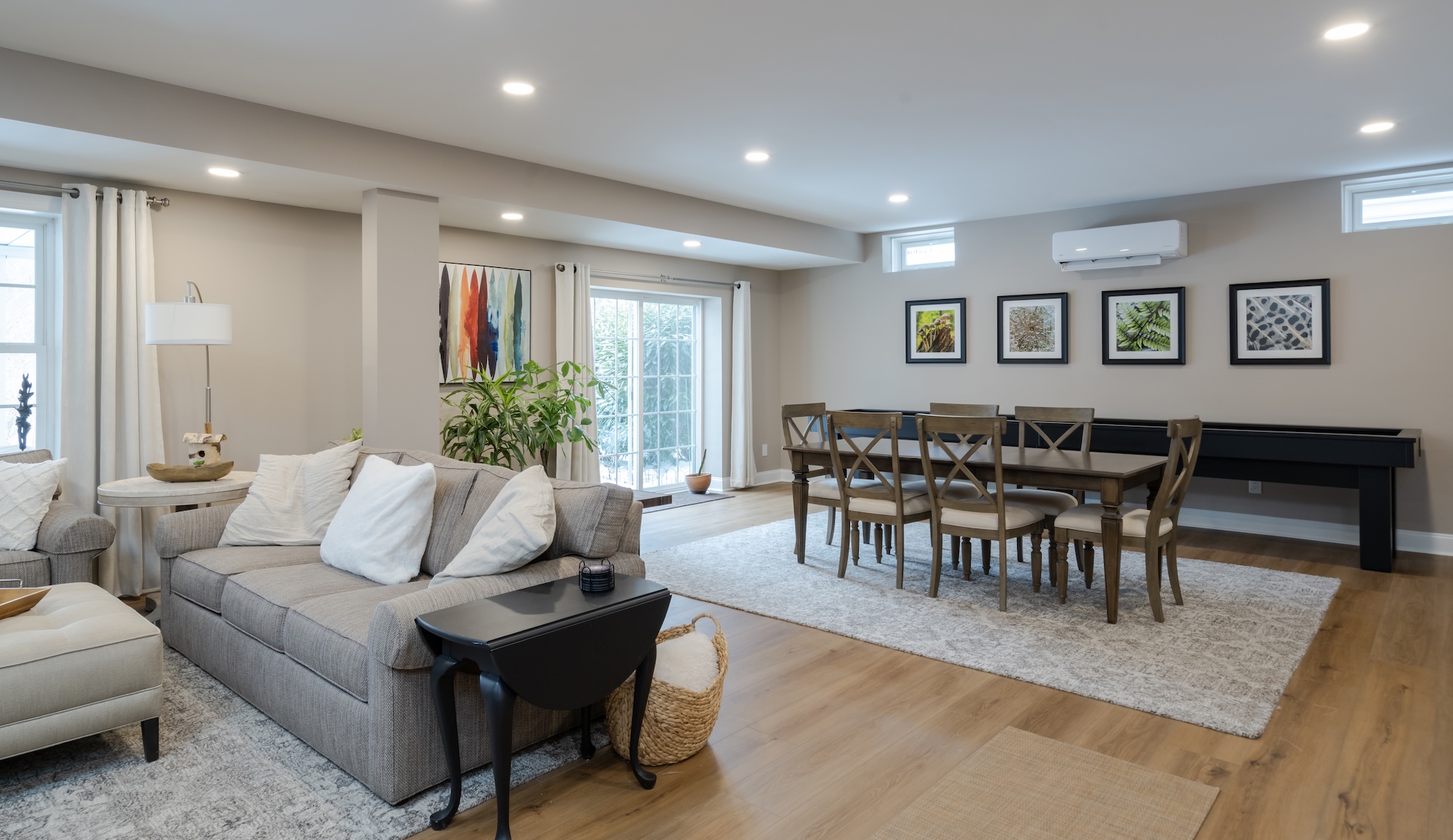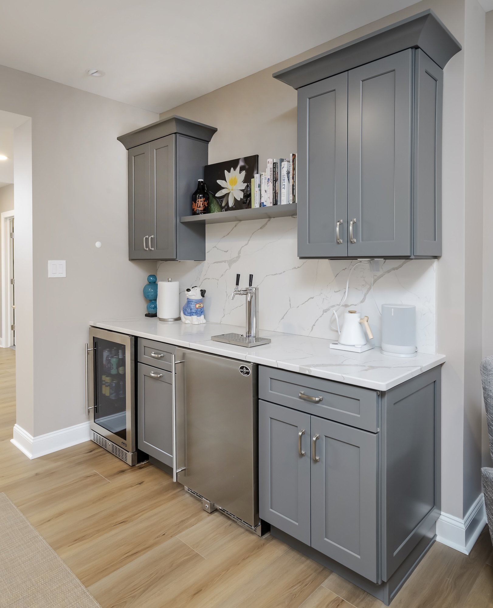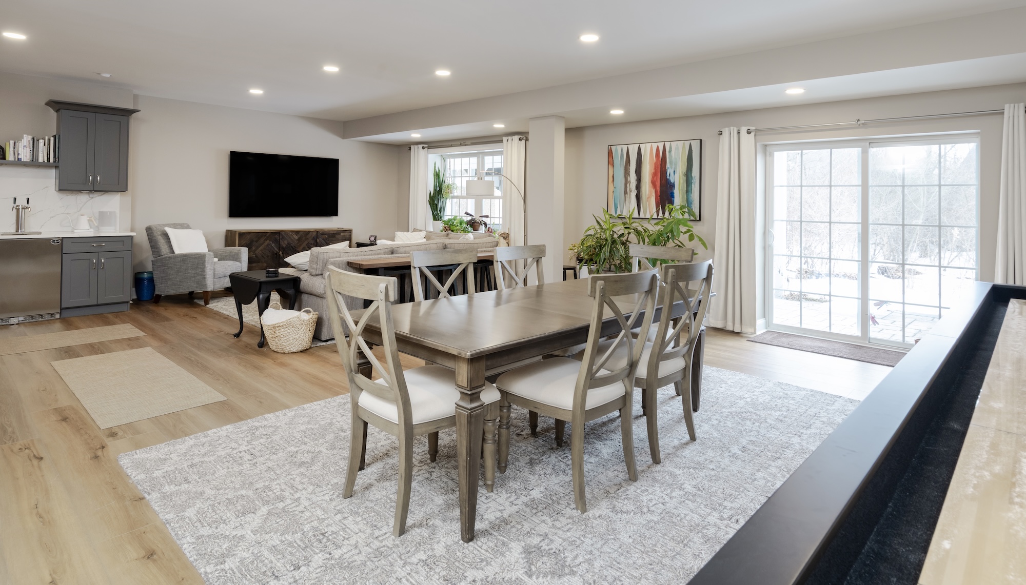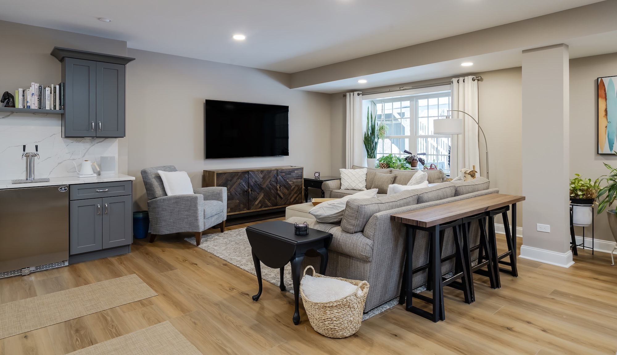 Beautifully finished basement in the Meadow Glen Community featuring a modern open-concept layout with luxury vinyl plank flooring, recessed lighting, and a bright, neutral design. The space includes a spacious living area, custom wet bar with gray cabinetry and beverage fridge, and a dedicated dining area with sliding glass doors for abundant natural light and walk-out access. Versatile and thoughtfully designed, it’s ideal for entertaining, relaxing, or a home office.
