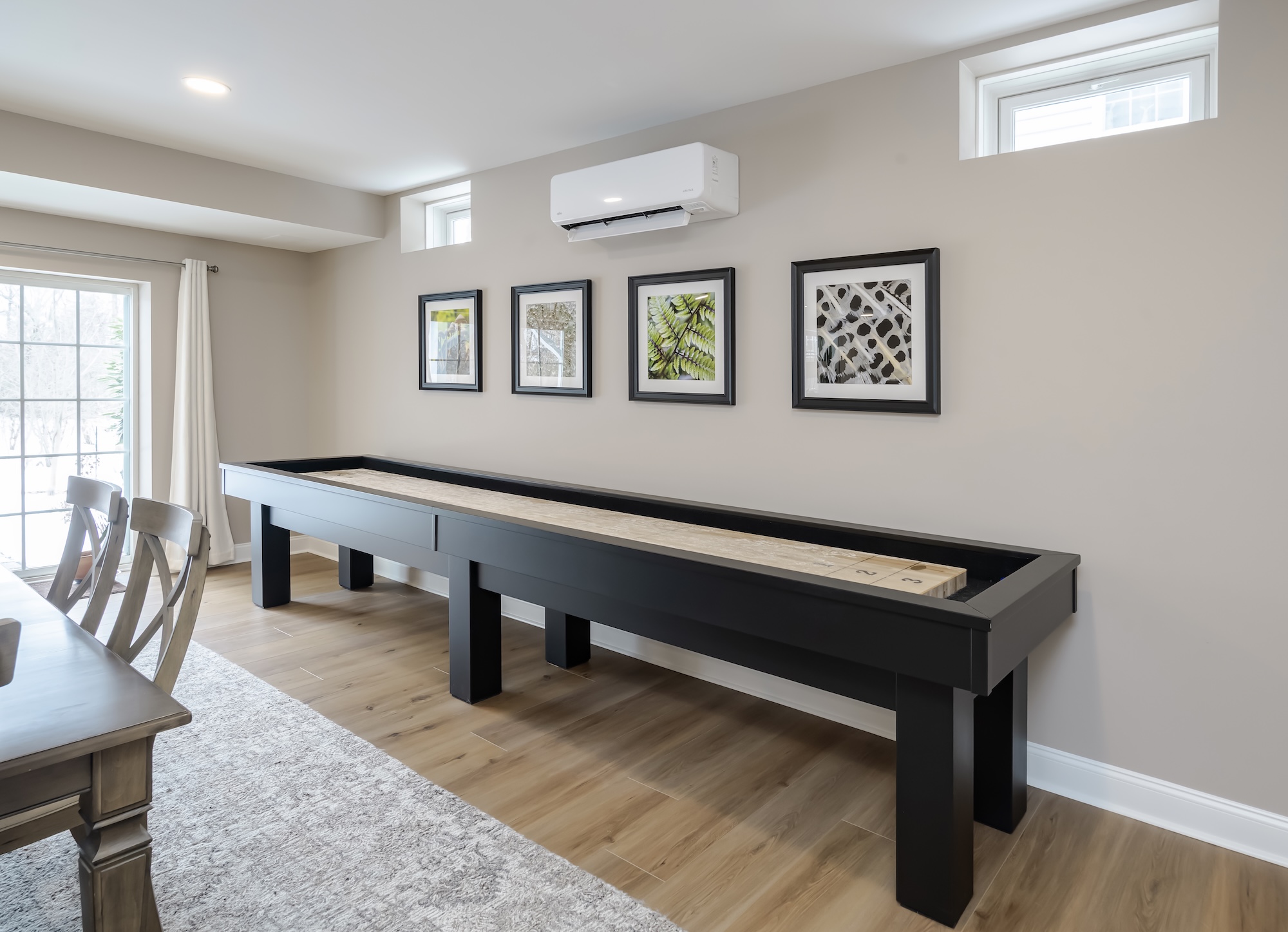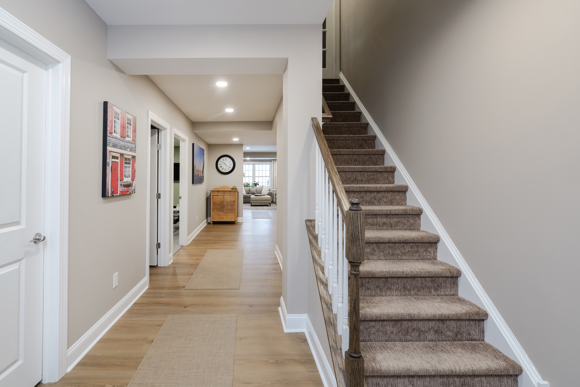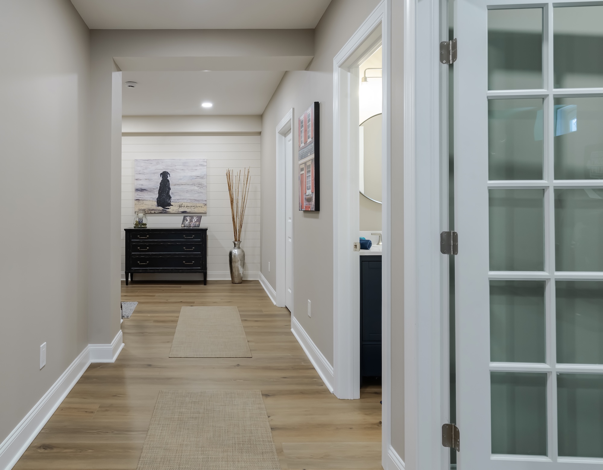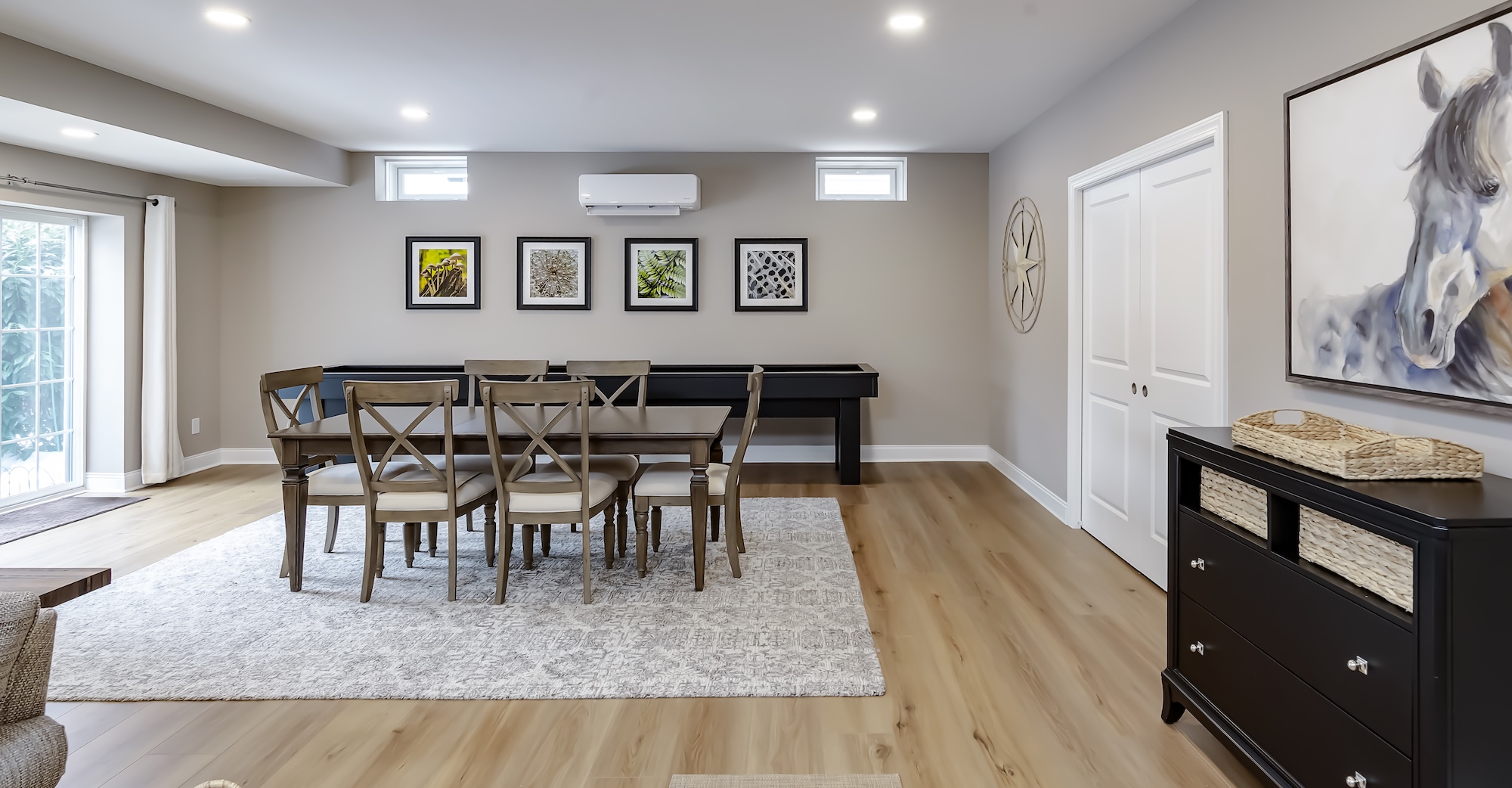 Beautifully finished basement in the Meadow Glen Community featuring a modern open-concept layout with luxury vinyl plank flooring, recessed lighting, and a bright, neutral design. The space includes a spacious living area, custom wet bar with gray cabinetry and beverage fridge, and a dedicated dining area with sliding glass doors for abundant natural light and walk-out access. Versatile and thoughtfully designed, it’s ideal for entertaining, relaxing, or a home office.