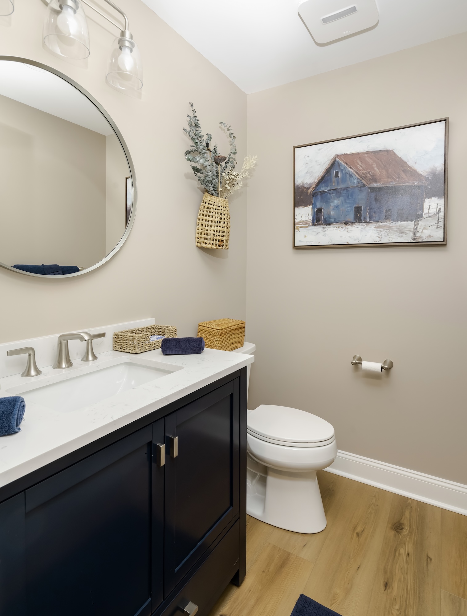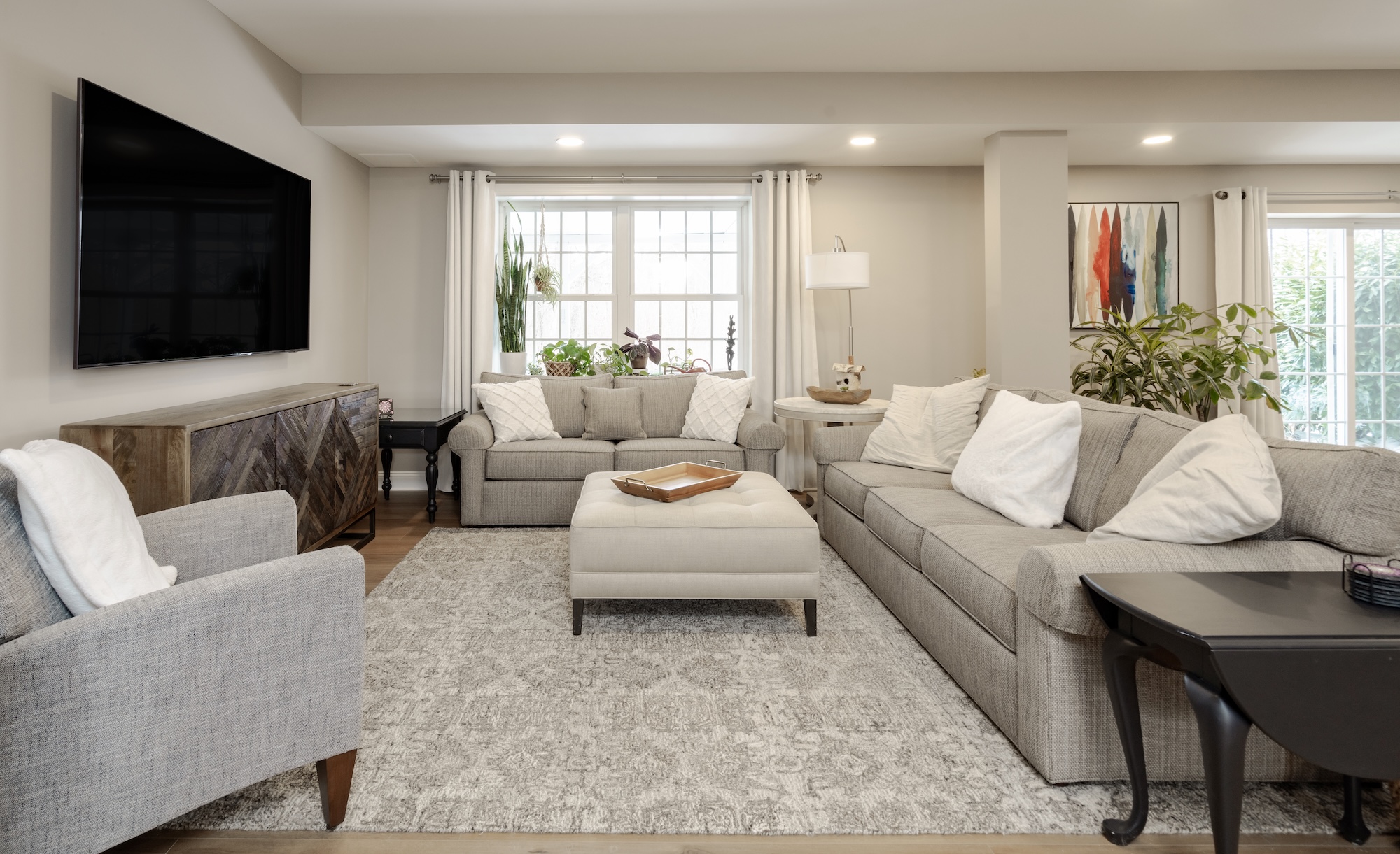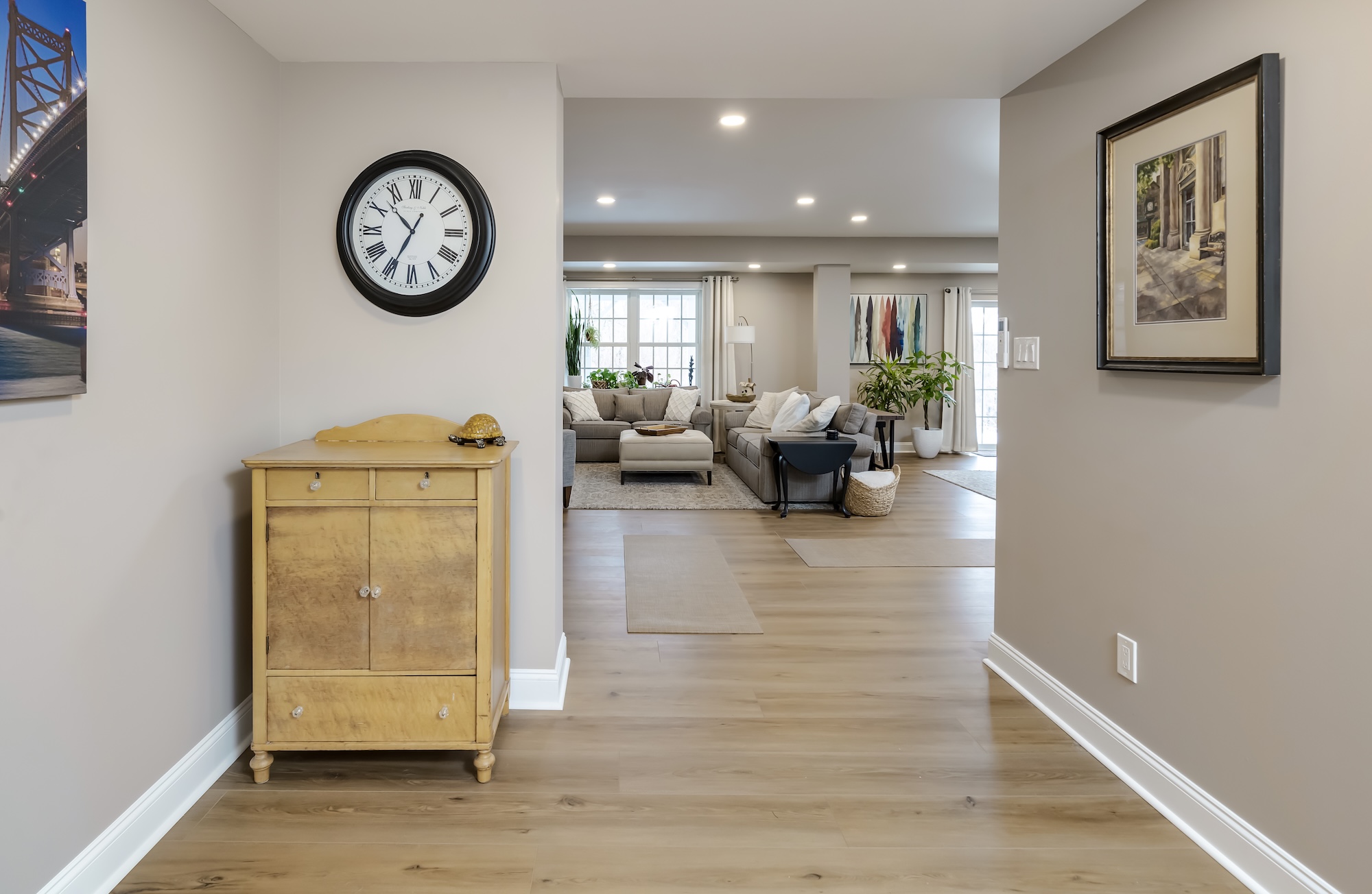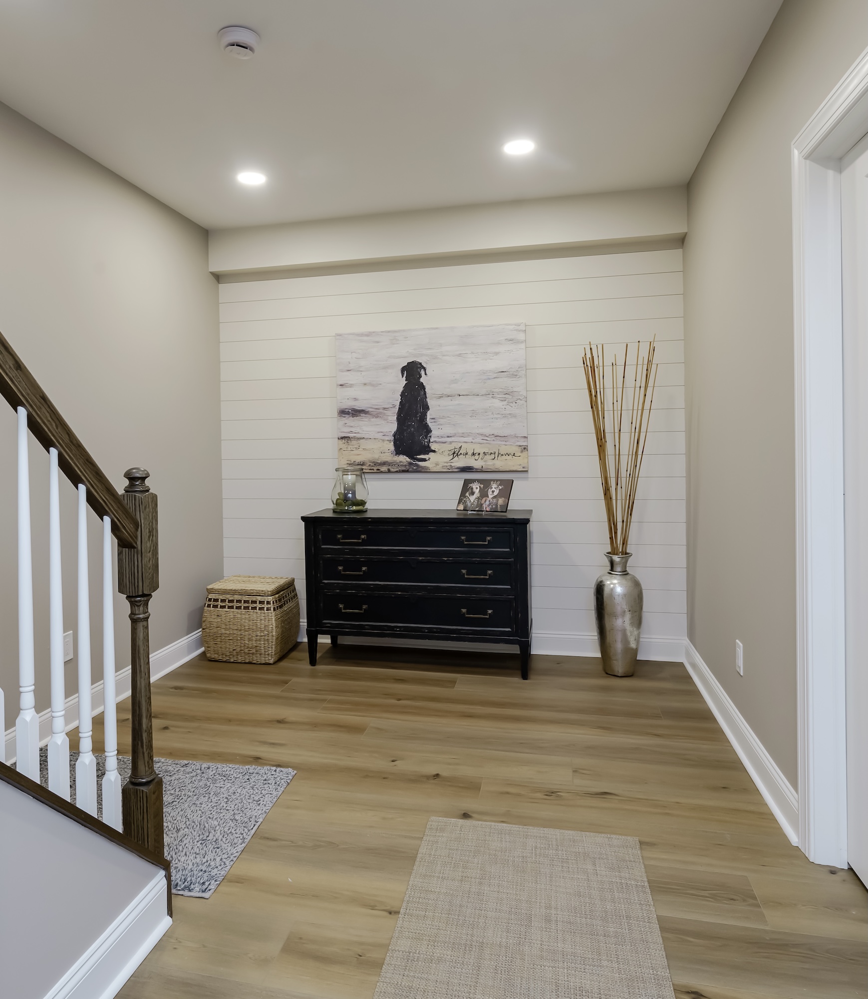 Beautifully finished basement in the Meadow Glen Community featuring a modern open-concept layout with luxury vinyl plank flooring, recessed lighting, and a bright, neutral design. The space includes a spacious living area, custom wet bar with gray cabinetry and beverage fridge, and a dedicated dining area with sliding glass doors for abundant natural light and walk-out access. Versatile and thoughtfully designed, it’s ideal for entertaining, relaxing, or a home office.