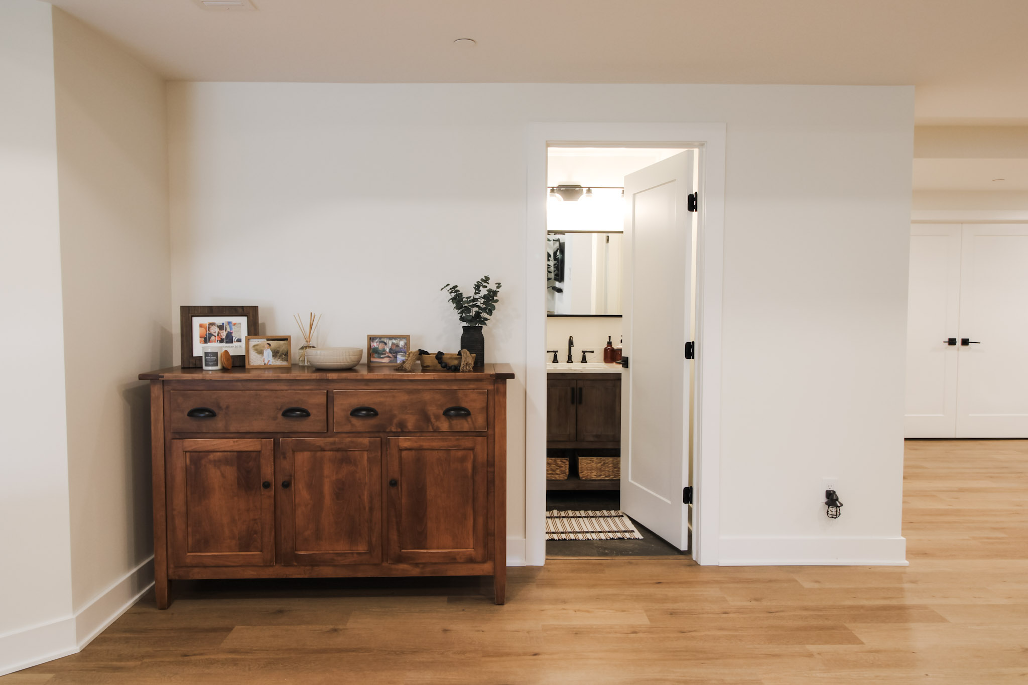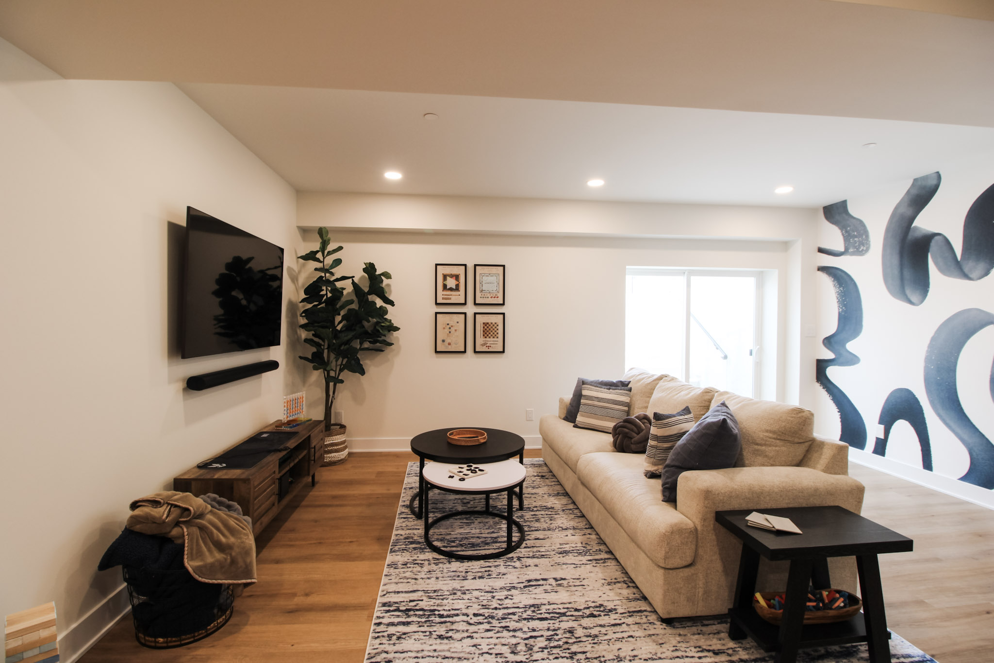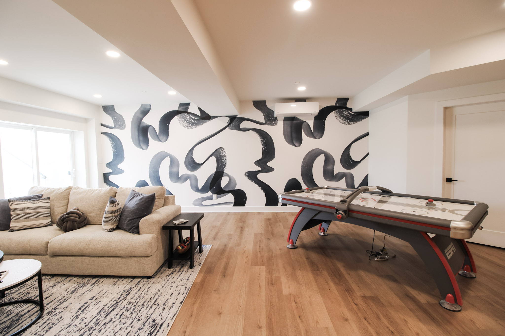This basement boats a kitchenette in Maritime blue with a spacious island, a powder room with custom open shelving, and a captivating mural. In addition, this basement is equipped with a hardwired 5 channel surround sound system for an immersive audio experience. Plus, there’s a separate gaming area featuring a kid’s gaming TV and an air hockey table, perfect for endless fun. And to keep the space comfortable, there’s an HVAC mini split system to ensure comfort for the homeowners.
