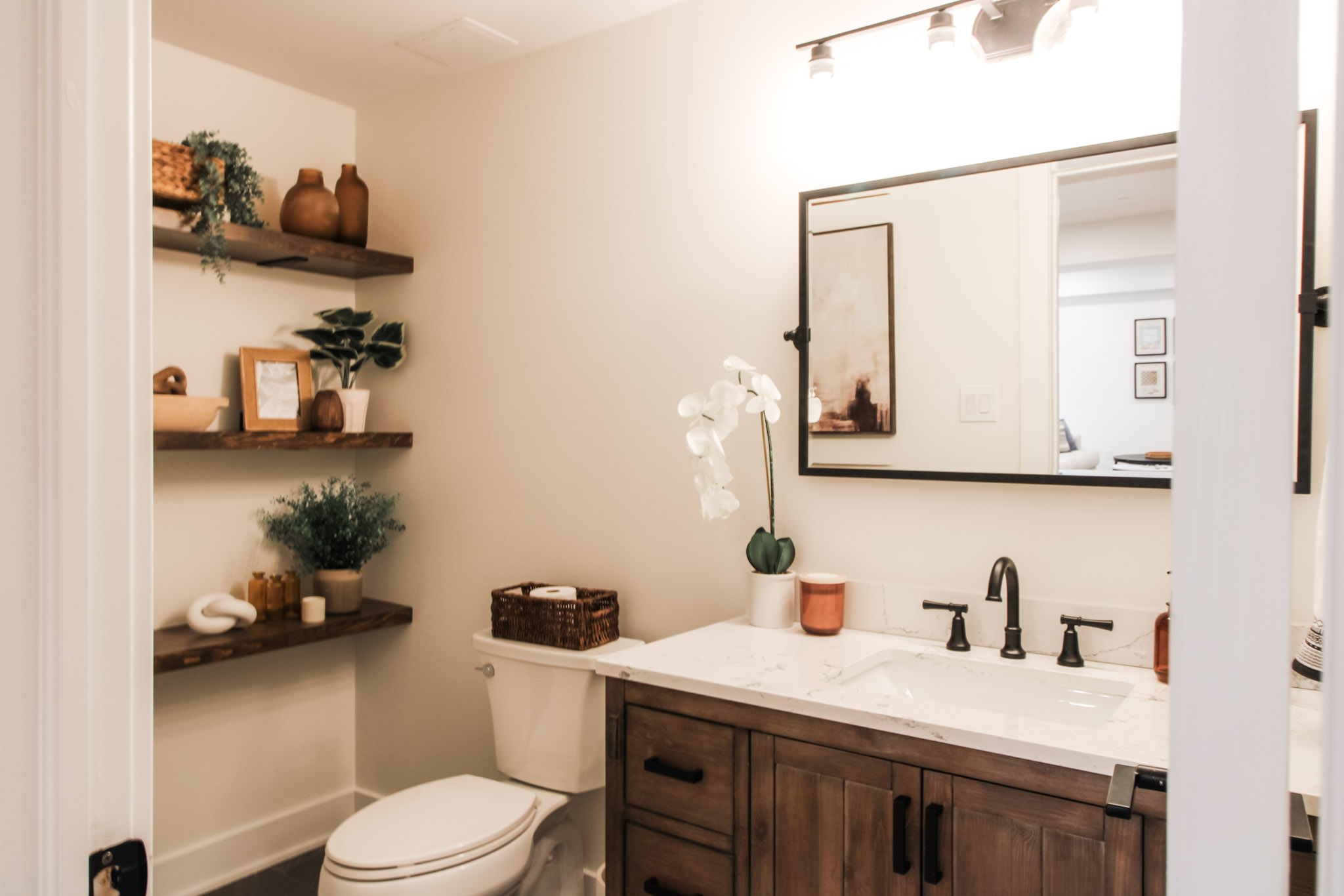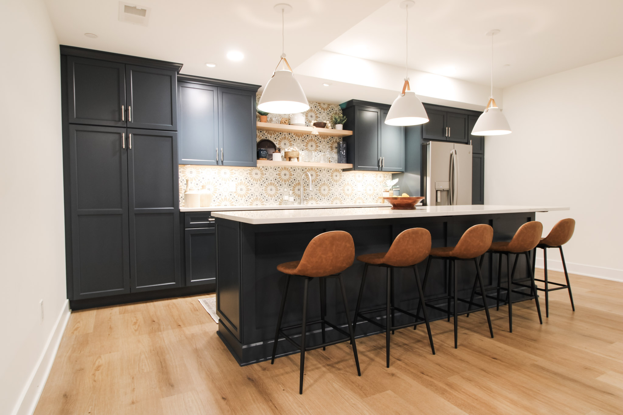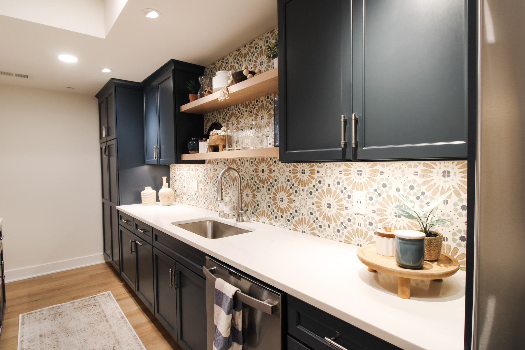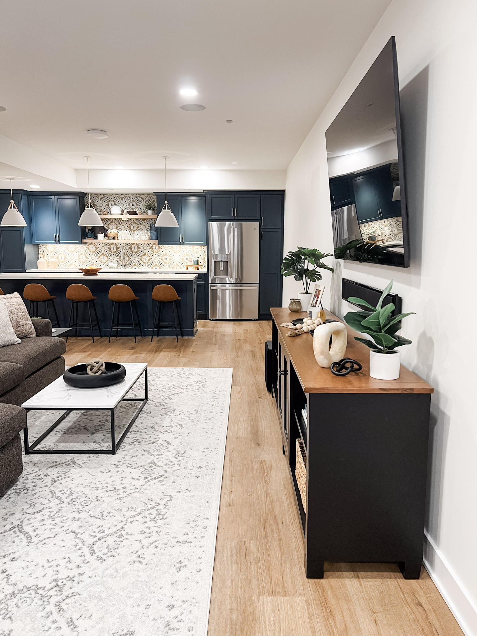 This basement boats a kitchenette in Maritime blue with a spacious island, a powder room with custom open shelving, and a captivating mural. In addition, this basement is equipped with a hardwired 5 channel surround sound system for an immersive audio experience. Plus, there’s a separate gaming area featuring a kid’s gaming TV and an air hockey table, perfect for endless fun. And to keep the space comfortable, there’s an HVAC mini split system to ensure comfort for the homeowners.