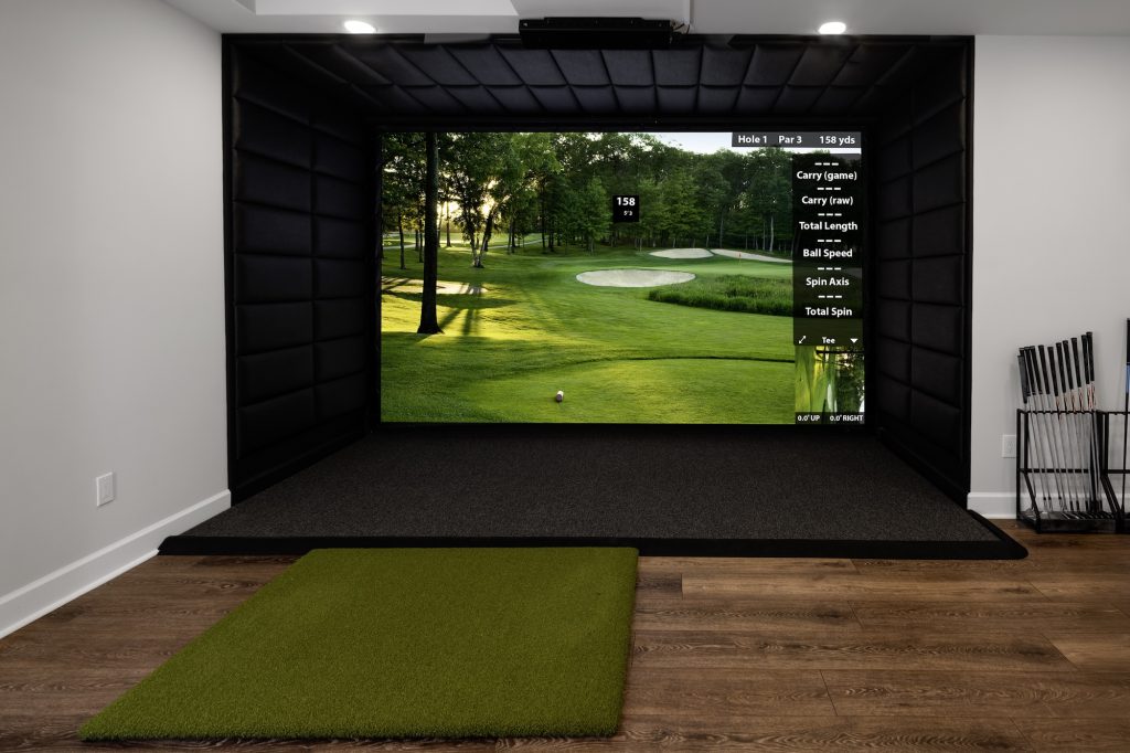 This finished basement in West Chester, PA was designed as a modern entertainment space featuring a custom indoor golf simulator and a stylish home bar. The result is a functional and inviting basement that combines recreation and social space for year-round enjoyment.