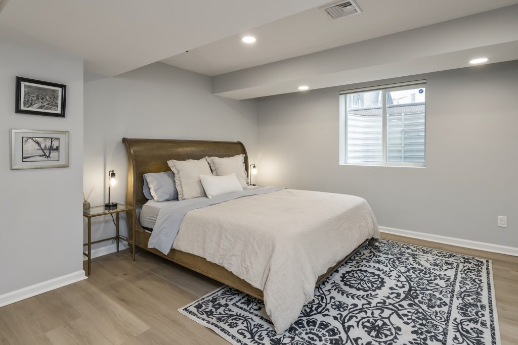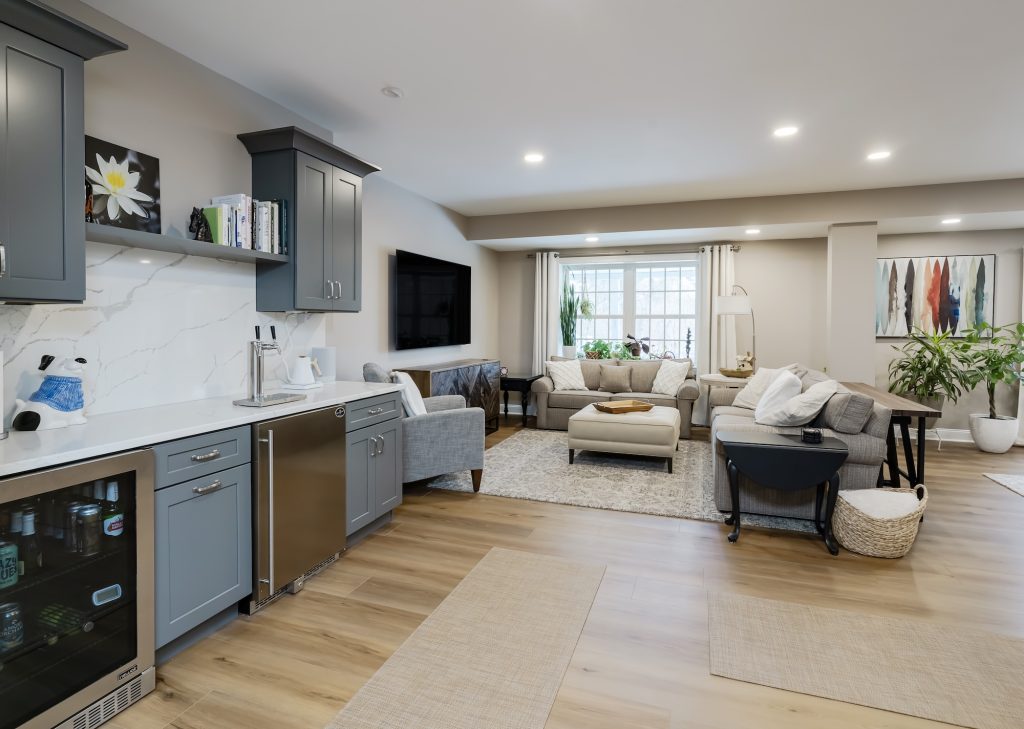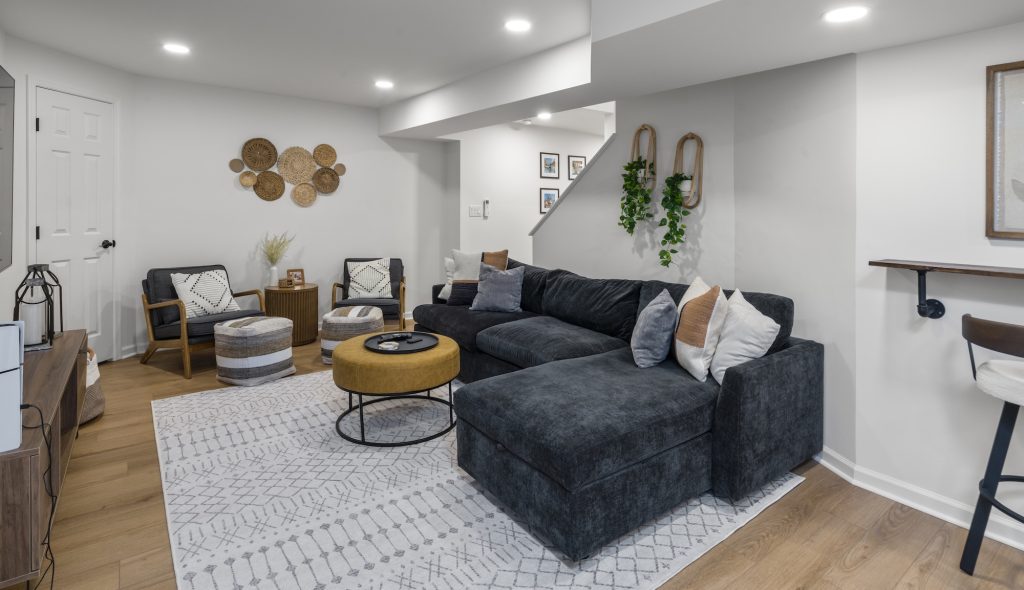 This beautifully Southampton, PA finished basement combines comfort, style, and functionality with a bright, modern design. The inviting living area features a cozy sectional, accent seating, and a sleek media setup, perfect for relaxing or entertaining. A custom bar-style counter adds a great space for casual dining or working from home, while warm finishes and thoughtful décor create a welcoming feel.